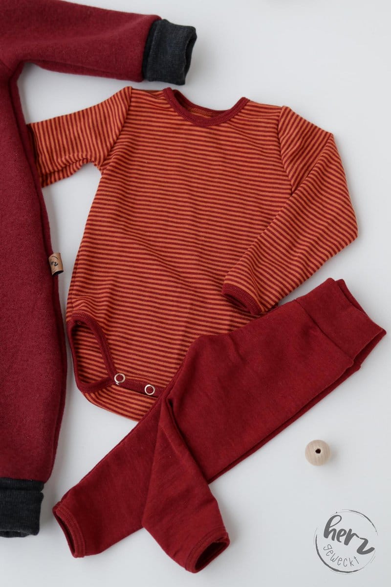Direkt auf der Haut beginnen wir mit einer Schicht aus Wolle-Seide. Ich habe dafür einen Langarmbody und eine Leggins genäht. Der Stoff liegt direkt auf der Haut und ist unglaublich fein und anschmiegsam. Zusätzlich ist der Stoff selbstreinigend.