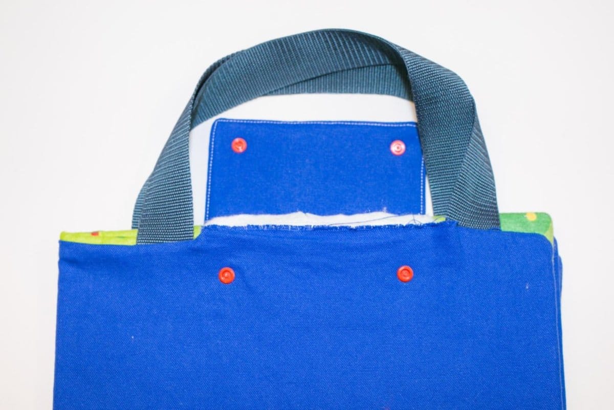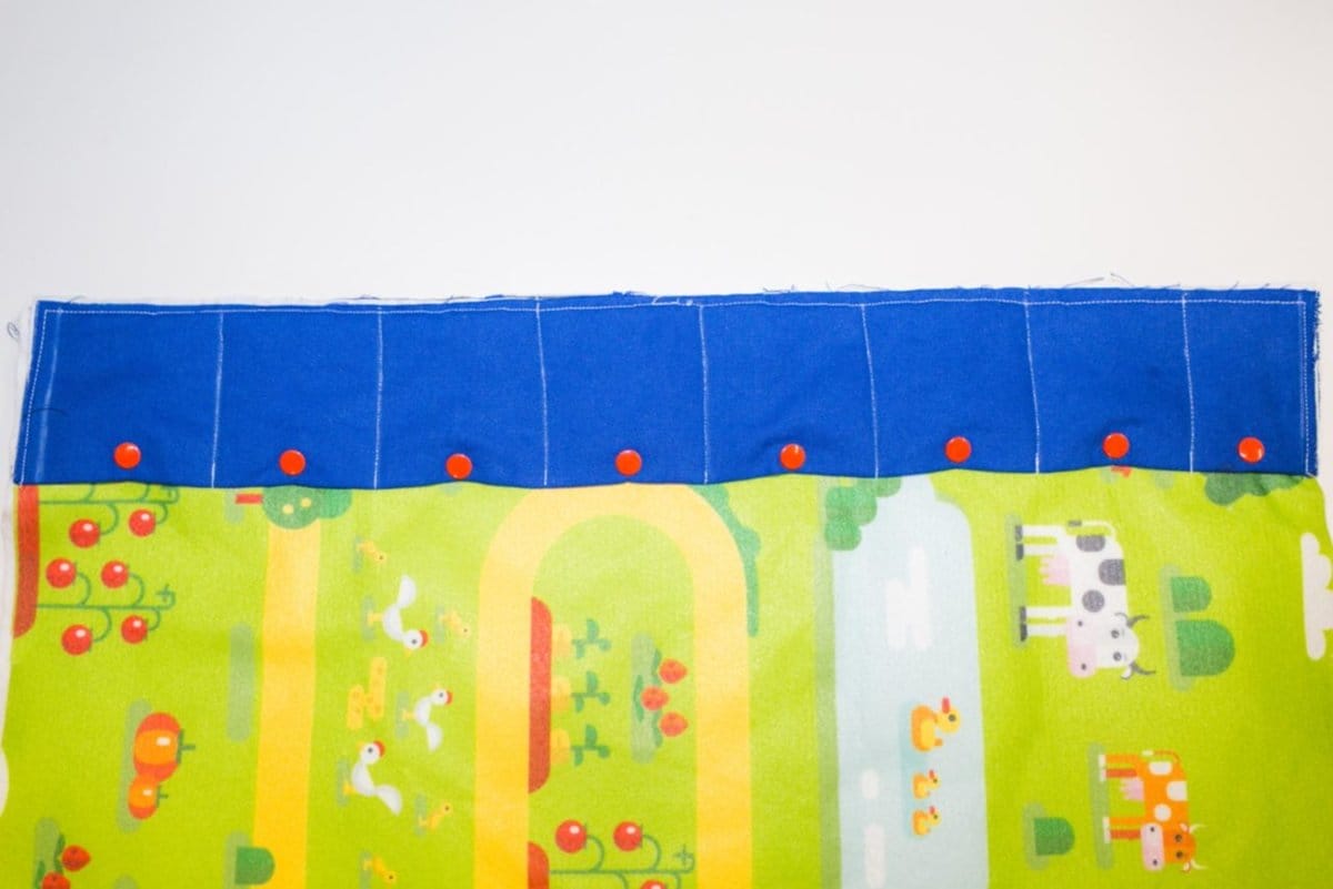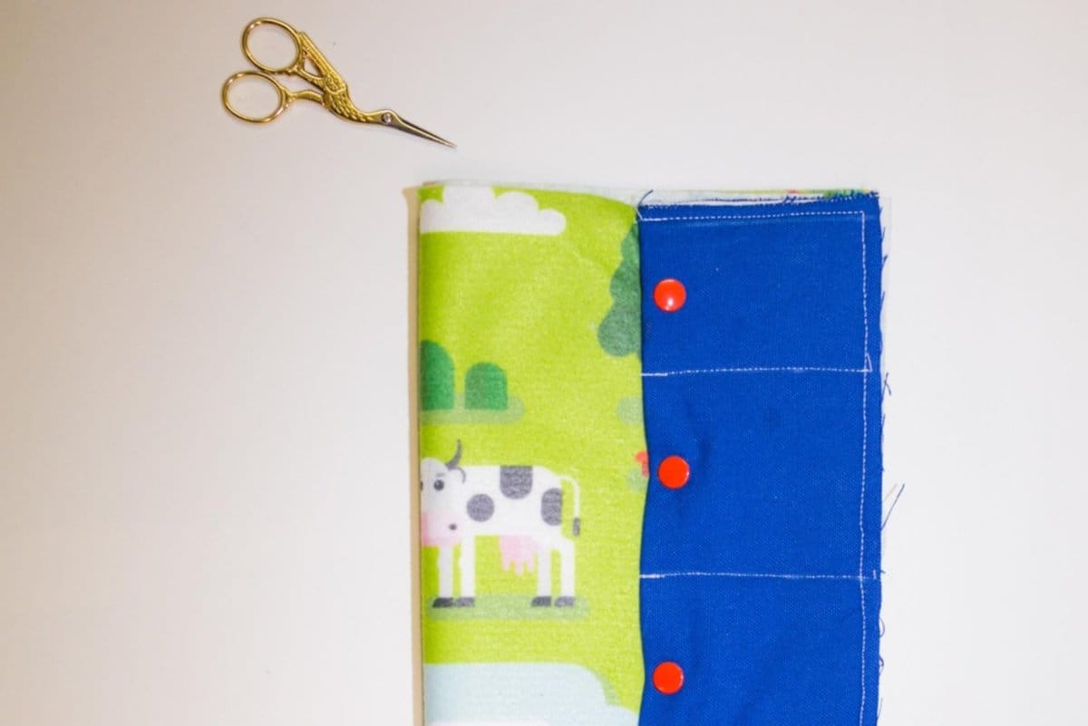 Steppt eure Fächer mit dem Dreifachgradstich ab und bringt die Druckknöpfe an. Es kann Sinn machen auf der Rückseite des Motivstoffs mit Vlies zu verstärken, damit die Knöpfe nicht ausreissen können.