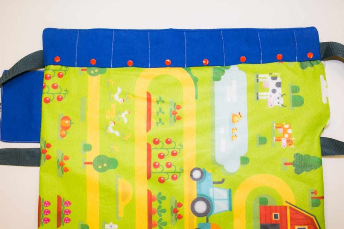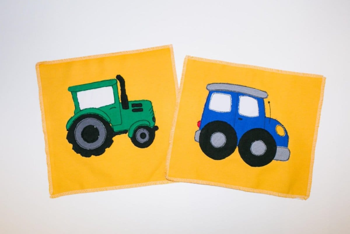 Falls ihr eure Spielteppiche auf der Aussenseite verzieren wollt, ist jetzt die Gelegenheit dafür diese vorzubereiten, bzw. direkt anzubringen. Ich habe aus Canvas in gelb, grün und blau einen Traktor und ein Auto (Vorlagen von Stickwolke) gestickt. Bei mir sind die Dekostücke ca. 22 x 22cm gross.