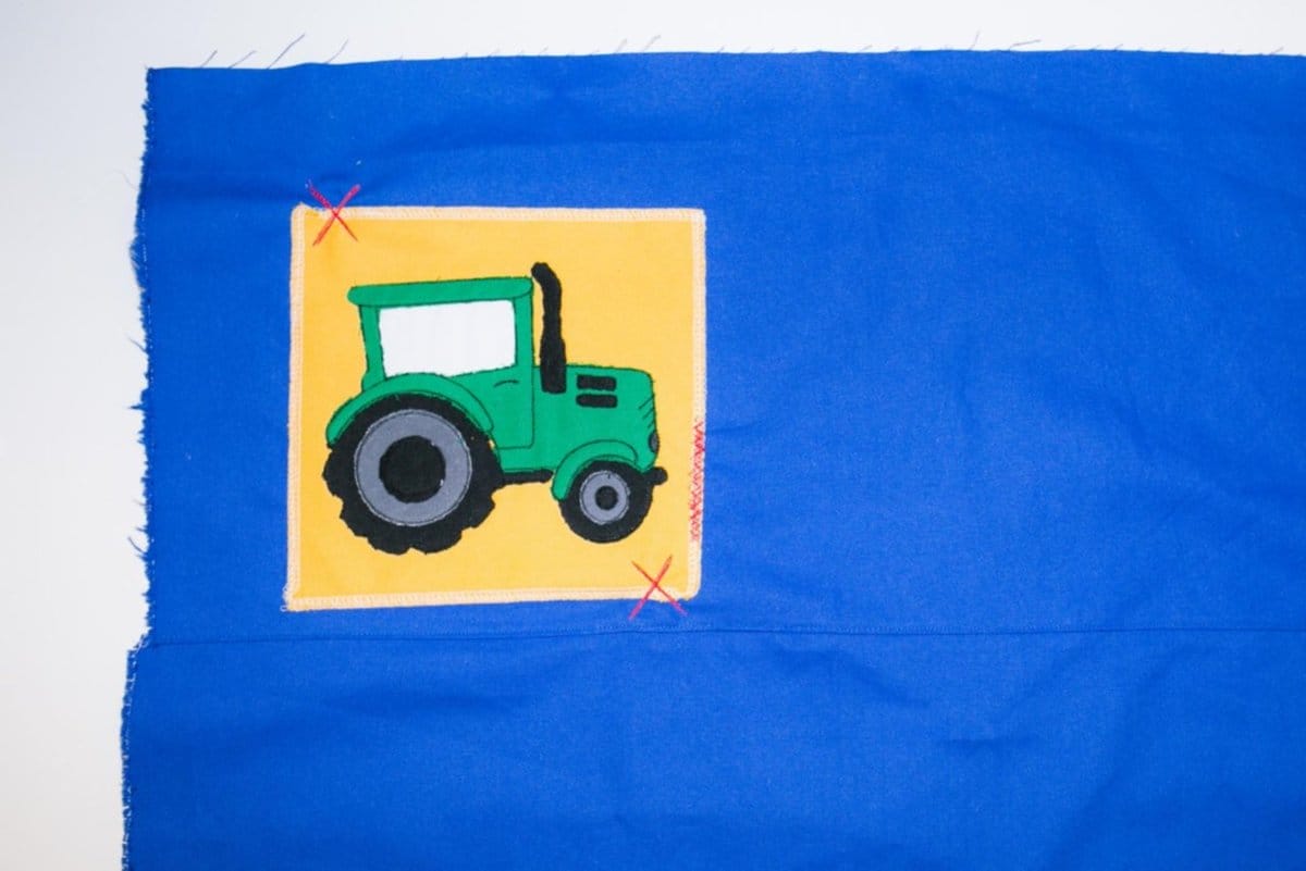 Nun nehmt ihr euch den Aussenstoff zur Hand und bringt eure Verzierung an, bzw. näht sie fest. Damit der Traktor am Schluss nicht Kopf steht, kann es hilfreich sein, den Aussenstoff kurz festzustecken und probezufalten, damit die Position der Verzierung sicher stimmt.