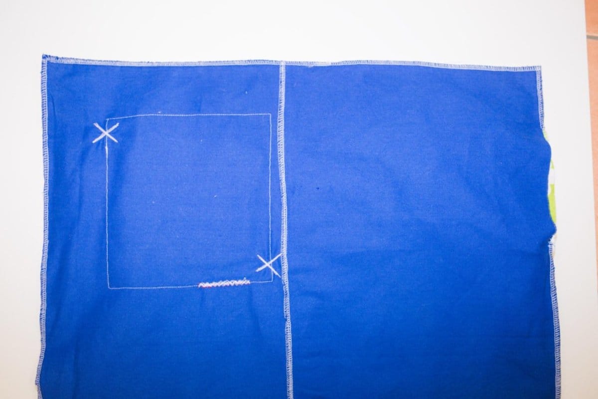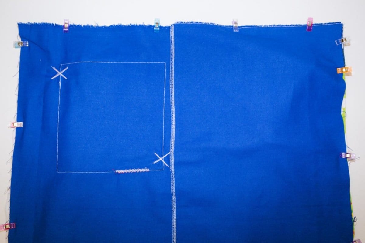 Nun markieren wir die Position der Verschlussklappe:Dazu faltet ihr den Stoff parallel zu der Seite, wo die Garagen/Fächer angebracht sind und dann gleich nochmal. Jetzt markiert ihr oben und unten mit einem Knips die Stelle, wo der äussere Falt ist.