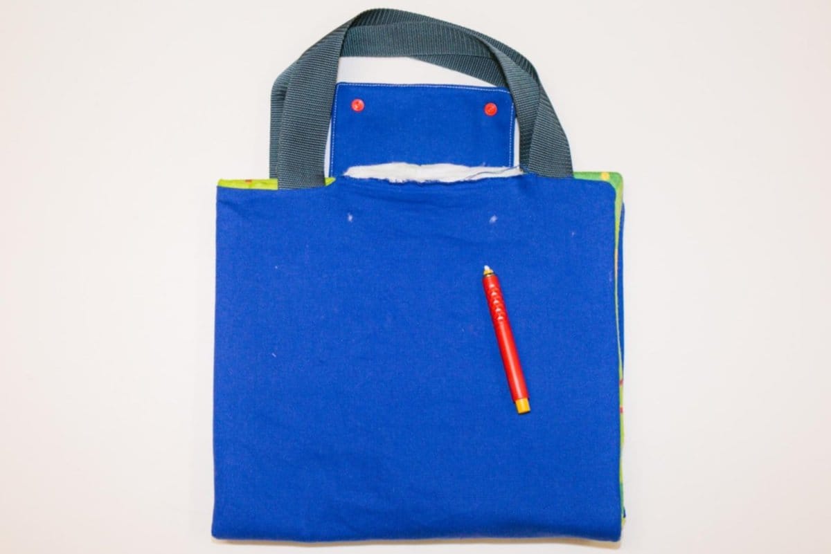Faltet den Teppich nun zusammen, wie wenn er fertig wäre.Bringt an der Verschlussklappe zwei Druckknöpfe an und markiert die Position auf dem Aussenstoff.