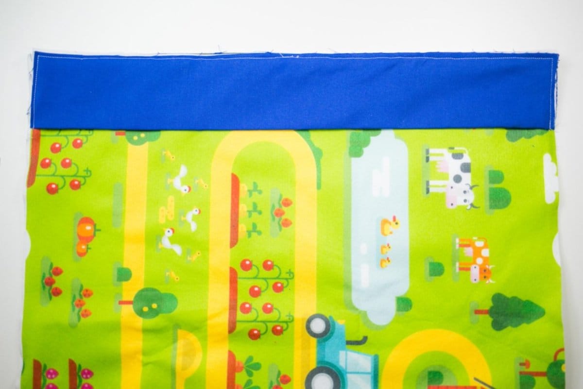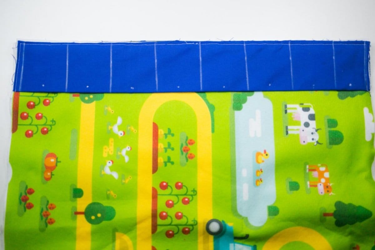 Wendet den Spielteppich durch die Öffnung. Formt die Ecken und Kanten gut aus und bügelt alles gut mit Dampf. Kontrolliert, ob ihr alle Gurtbänder und Schichten erwischt habt beim Zusammennähen. Jetzt könnt ihr das noch einfach korrigieren.
