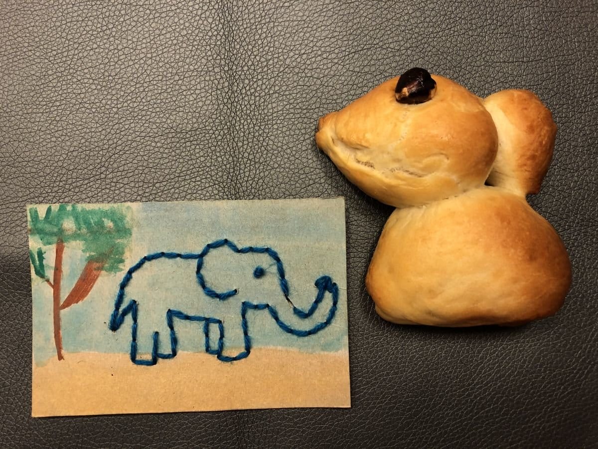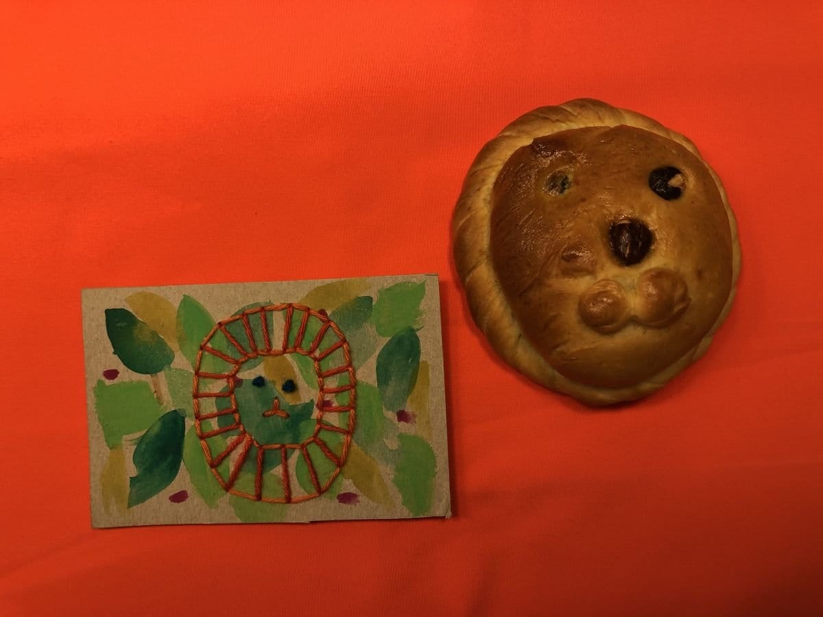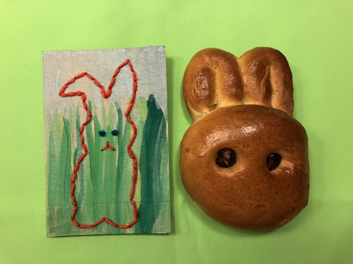 Übrigens: Es müssen ja nicht bloss Oster-Motive sein! Diese Technik kann man natürlich ganz allgemein anwenden! Esther von Stoffwald hat hier Stickkarten gemacht mit Zootieren. Und dann gleich noch die entsprechenden Zopfteig-Tiere dazu gebacken und verschenkt. Kam super an! Als Karton diente die Rückseite eines Cornflake-Kartons, den sie (bzw. ihre Kinder) dann noch mit Wasserfarben bemalte.