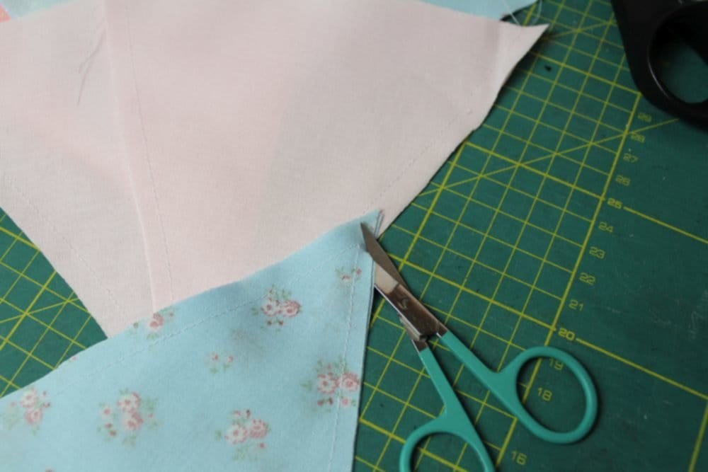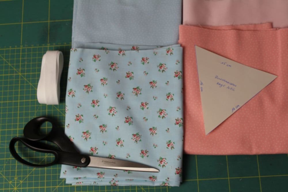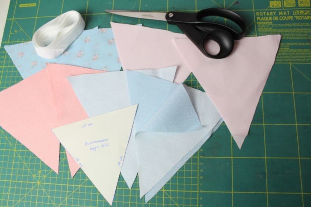 Die Grösse der benötigten Stoffstücke richtet sich nach der Grösse, die die Wimpel haben sollen. Meine Wimpel hier sind am oberen Rand 15 cm und an den Seitenrändern 16 cm lang. Bitte bedenkt beim Heraussuchen der Stoffe, dass zu diesen Abmessungen noch die Nahtzugabe von ca 0.7 bis 1 cm hinzuzufügen ist.