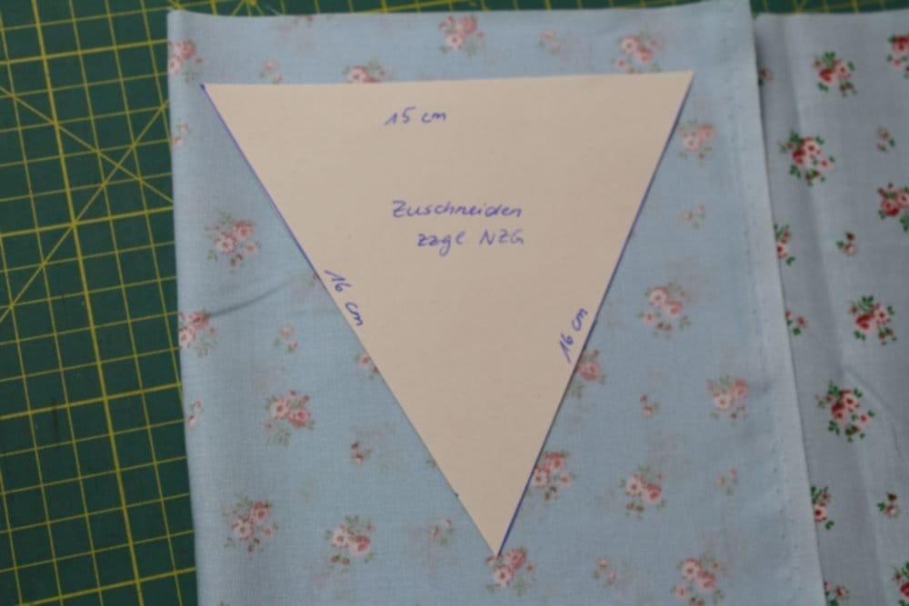 Für eine Wimpelkette braucht es ja nicht wirklich ein «Schnittmuster» – aber es hilft, wenn das Dreieck schon vorgezeichnet ist. Ich habe die Wimpel mit einer Kantenlänge von 15 und 16cm zugeschnitten. Du kannst dir eine Vorlage hier herunterladen: