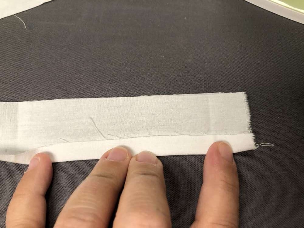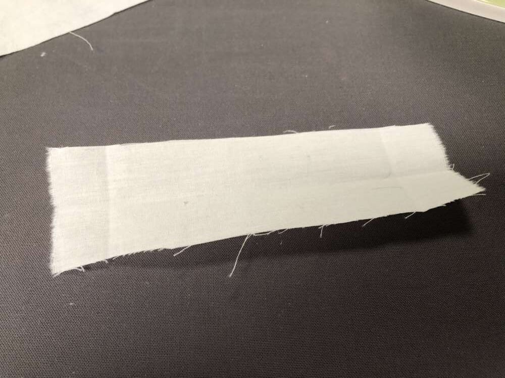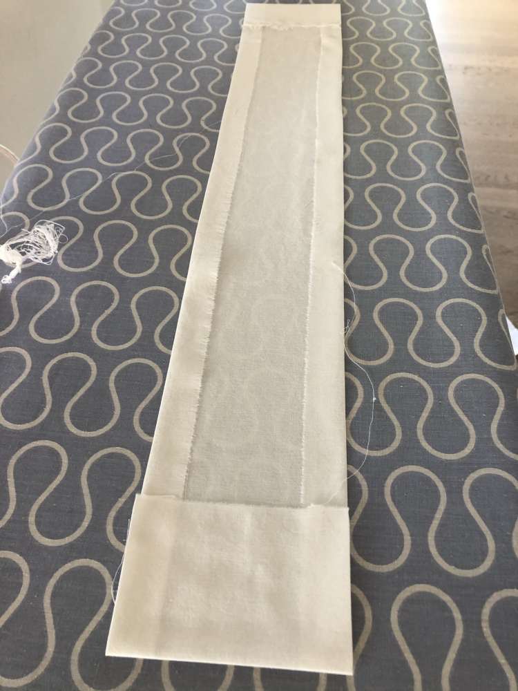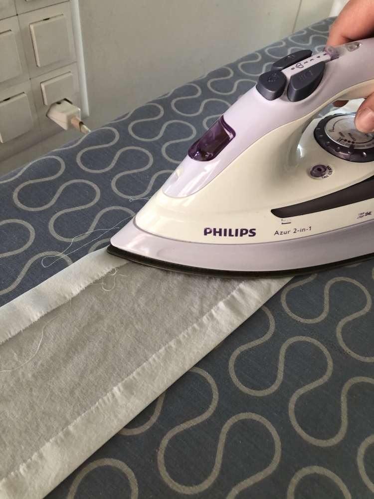 - Streifen vorbereiten und bügeln: Schneide dir den Streifen, wo du die Äpfel drauf stempeln möchtest, zu, lass dabei ca. 2cm Nahtzugabe und bügle diese um, so dass du am Ende einen schönen parallelen Streifen hast, bügle ihn gut. Ich habe ihn ca. 10cm breit gemacht (fertige Breite) und so lang, wie das Tuch hoch ist.