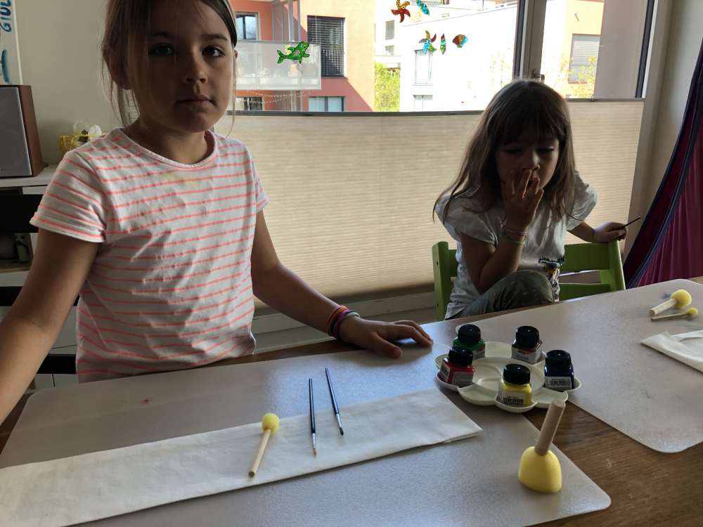 Achtung: Waffelstoff besteht in der Regel aus 100% Baumwolle und kann bis zu 10% eingehen! Kalkuliere also nicht zu knapp (ausserdem kann es sein, dass der Stoff leicht schräg zugeschnitten ist….!) - Arbeitsplatz vorbereiten: Decke den Tisch mit Zeitungen oder einer anderen Unterlage ab. Stelle die Stoffmalfarben und Pinsel (oder Schwämmchen) bereit.