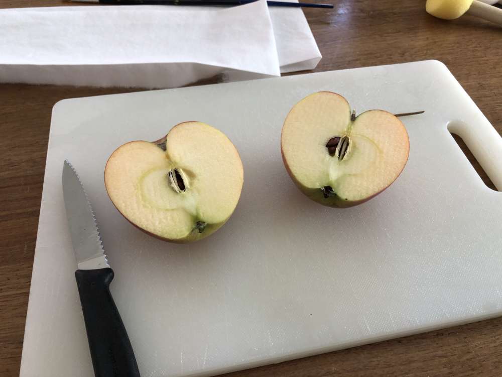 - Apfel halbieren: Wenn alles soweit parat ist, kannst du den Apfel halbieren. Achte dabei darauf, dass die Schnittfläche ganz gerade ist, sonst wird der Abdruck nicht schön.