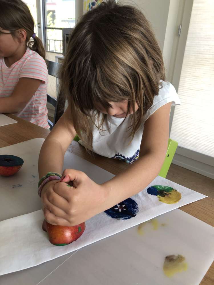 Tipp 2: Nach einer gewissen Anzahl Stempel-Durchgängen ist der Apfel «durch». Dann kannst du einfach versuchen eine ganz dünne, aber gerade Schicht vom Apfel abzuschneiden um wieder eine saubere und glatte Fläche zu haben. Ich geb’s zu, dies ist nicht ganz einfach, aber ein Versuch ist es wert.