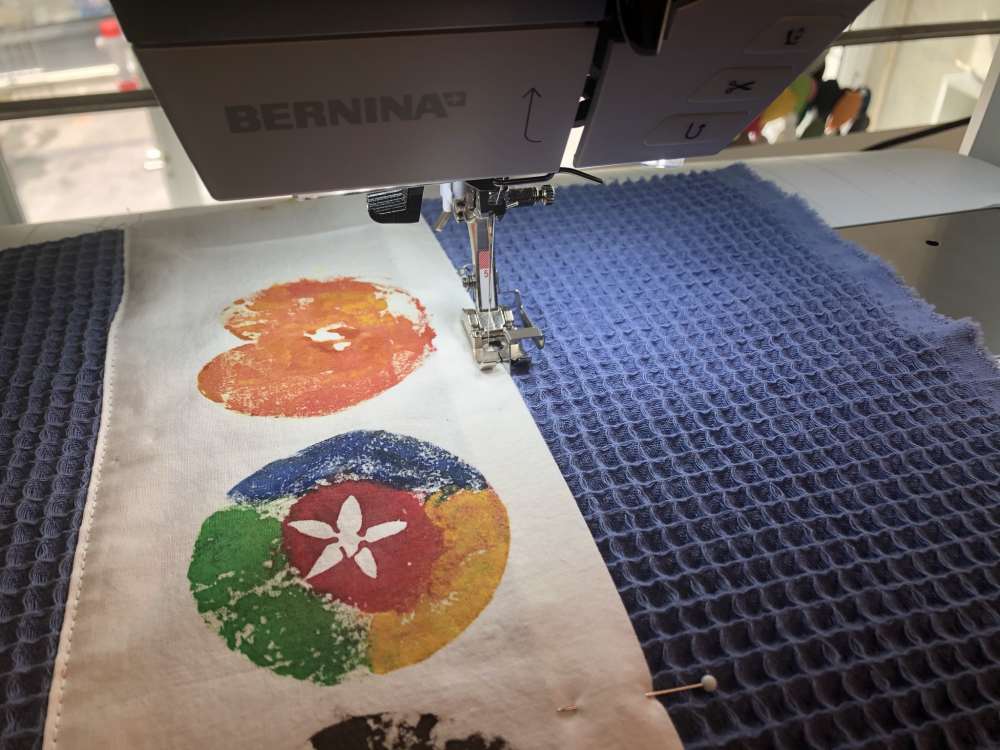 Nun kannst du den mit Äpfeln bedruckten Streifen so aufs Handtuch nähen, wie du möchtest. Dabei einfach den Streifen aufs Waffeltuch steppen.