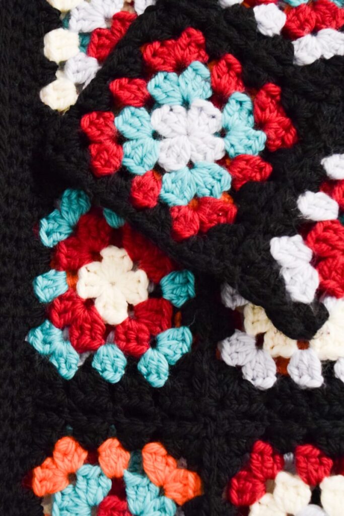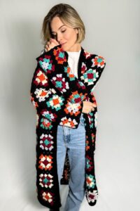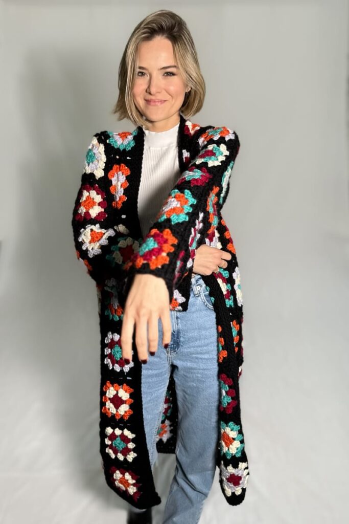 Die Anleitung ist für Grösse M, Oberkörperumfang 96cm und kann leicht angepasst werden, indem entweder mehr Runden des Granny Squares oder mehr Granny Squares gehäkelt werden.