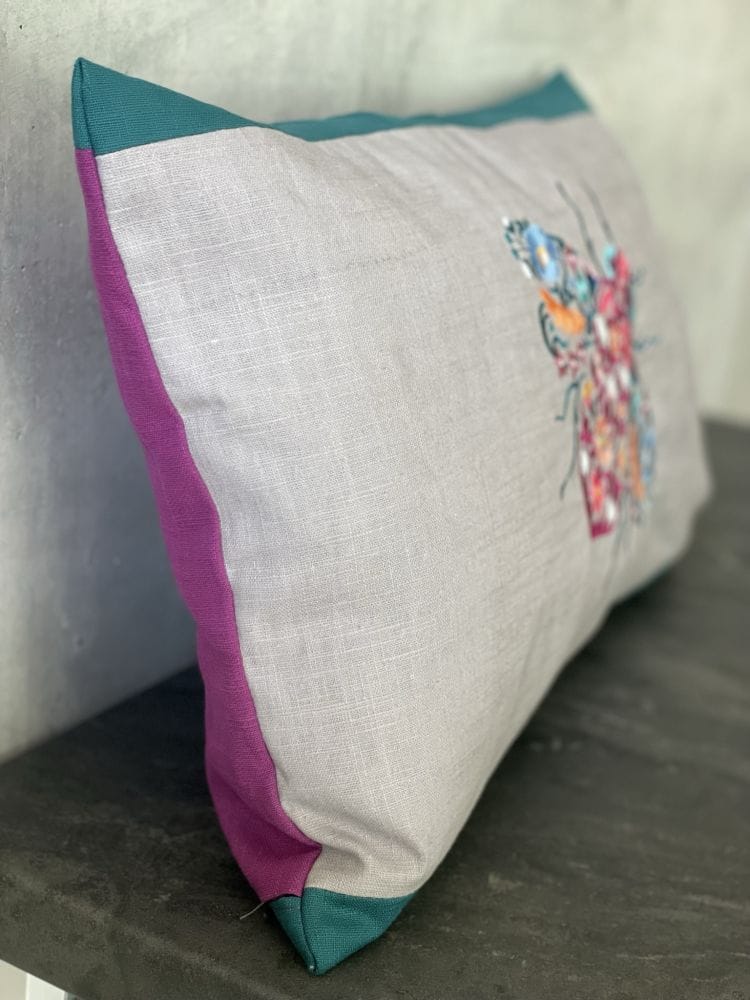 Da ich für die Rückseite des Kissens eine andere Farbe nehmen musste von meinen Stoffresten, habe ich dieselbe Pflaumenfarbe für die Hauptfarbe des Käfers verwendet. Als schöne Kontrast- und Verbindungsfarbe zwischen dem Steingrau und dem Pflaumenblau habe ich ein dunkles Petrol genommen. Und für die vielen verschiedenen Details fröhliche Farben von Gelb über Orange bis zu Pink und Türkis.