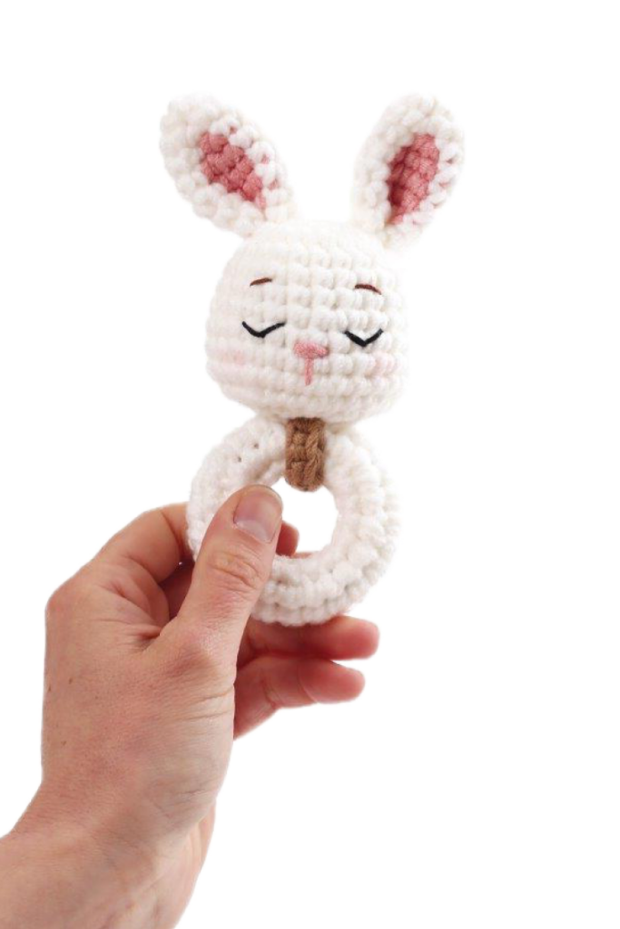 Ein Häkelset, mit dem du eine niedliche Rassel für kleine Hände in Hasenform herstellen kannst – mit einem sanften, leisen Geräusch.