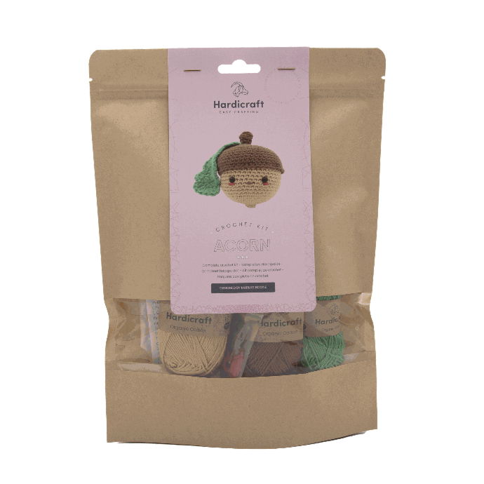 Die Bäume verlieren ihre Blätter und die Eicheln fallen um dich herum herunter. Es ist Herbst und die perfekte Zeit, um deine Häkelnadel zu nehmen und die Eichel zu machen. Zusammen mit dem Pilz vervollständigen Sie Ihr Set. Dieses Set enthält ein Muster, hochwertiges Garn aus 100 % Bio-Baumwolle und alle benötigten Kurzwaren (ausser der Häkelnadel), um loszulegen. Die Eichel ist ca. 9 cm hoch und wird mit einer Häkelnadel 2.5 mm gehäkelt.