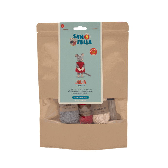 Erwecke die Geschichten aus dem Mäusehaus mit Sam zum Leben. Erlebe die Abenteuer aus den Büchern noch einmal oder denke dir deine eigenen aus – mit unseren kuscheligen Plüschmäusen, perfekt zum Spielen und Liebhaben. Die Mäusehaus-Familie wächst immer weiter… lerne sie alle kennen! Dieses Set enthält ein Muster, hochwertiges Garn aus 100 % Bio-Baumwolle und alle benötigten Kurzwaren (ausser der Häkelnadel), um loszulegen. Julia ist ca. 12 cm hoch und wird mit einer Häkelnadel 2.5 mm gehäkelt.