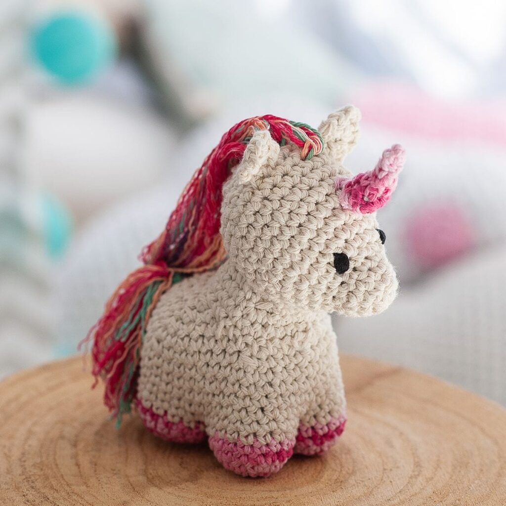 Dieses magische und farbenfrohe Einhorn namens Nora ist das neueste Mitglied unserer Hoooked Familie. Das Einhorn ist mit unserem Recycling-Baumwollgarn Eco Barbante gehäkelt und ist ca. 17 cm hoch.