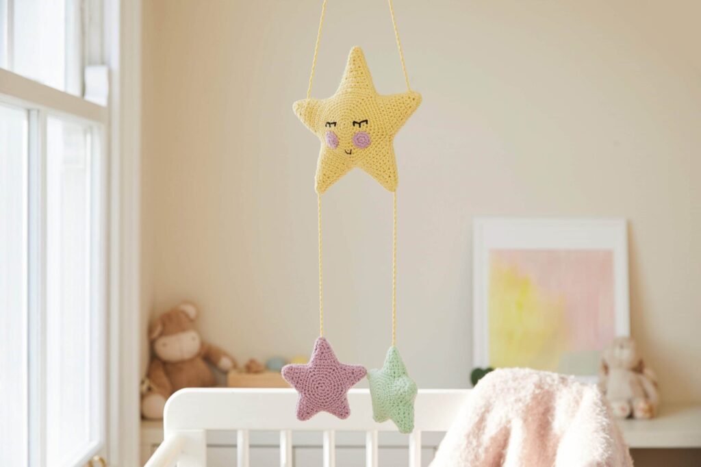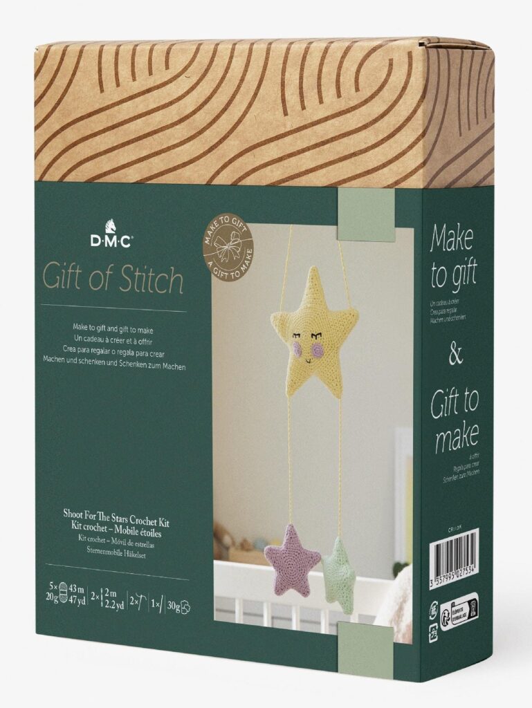 Eine sanfte Sternennacht, um ein neues Kinderbett zu schmücken. Dieses Set ist ein durchdachtes neues Babygeschenk. Schleife und Geschenkanhänger inklusive. Box als Geschenkverpackung wiederverwenden. Wenn Sie nach einem Geschenk suchen, um einen neuen Kleinen auf der Welt willkommen zu heissen, dann ist dies die perfekte Wahl. Dieses sternenklare Mobile schafft die magischste Szene, die Sie über dem Bett, der Wiege oder dem Wickeltisch eines Babys aufhängen können. Entwickelt als Teil unserer Gift of Stitch-Reihe. Entscheiden Sie sich, das Kit selbst zu erstellen, um es als einzigartiges, besonderes Geschenk für einen geliebten Menschen zu verschenken. Oder geben Sie das Kit selbst, damit sie die Entspannung und Freude am Basteln entdecken können. Es gibt sogar ein Band und einen nähbaren Geschenkanhänger.