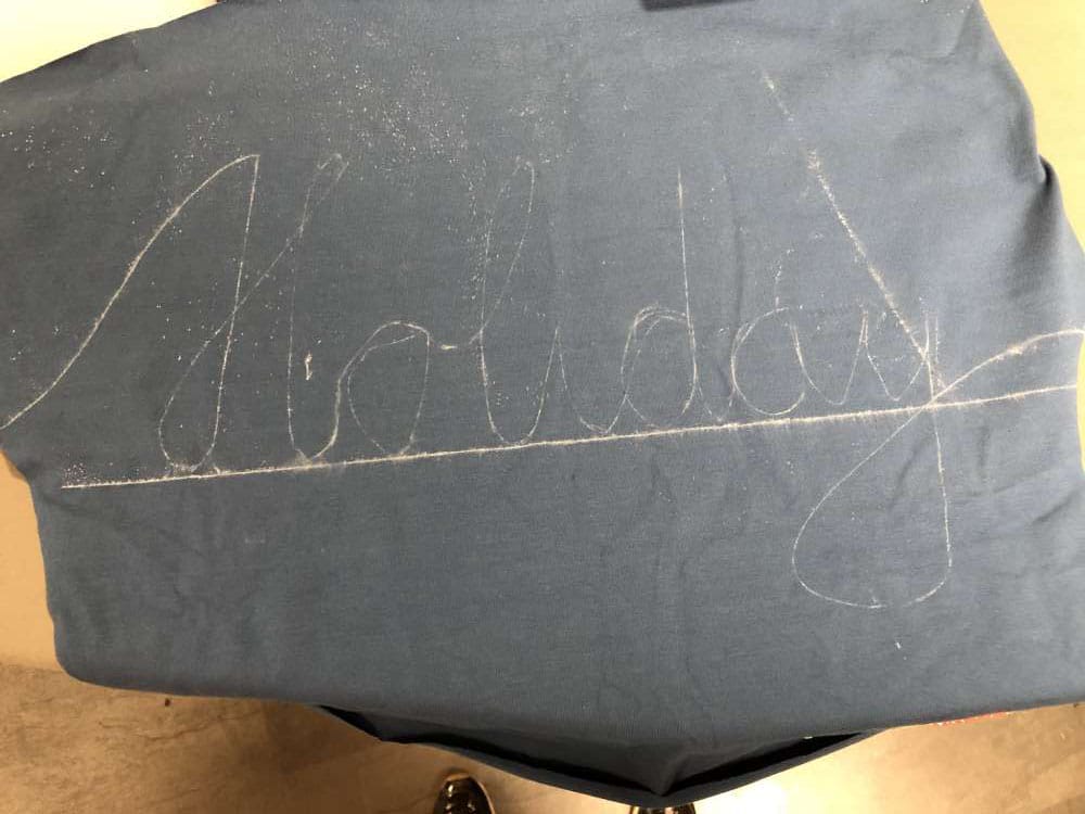 Markierstift: Du brauchst unbedingt einen Markierstift, den du wieder «ausradieren» kannst, falls du den Schriftzug zum Beispiel noch etwas anpassen musst. Ich habe ein einfaches Kreiderädchen benutzt. Da kann man die Kreide einfach «wegpusten» und das Anzeichnen geht prima. Nach dem Nähen war praktisch nichts mehr zu sehen von der Kreide. Die Kreidepatronen zum Nachfüllen gibts in weiss und gelb.