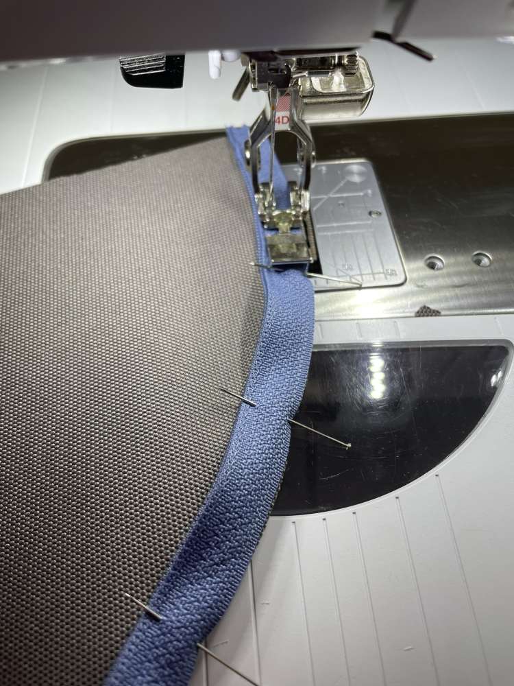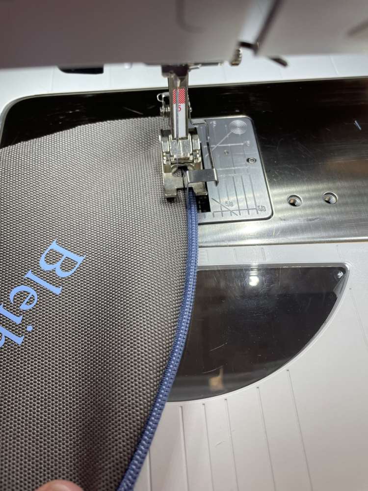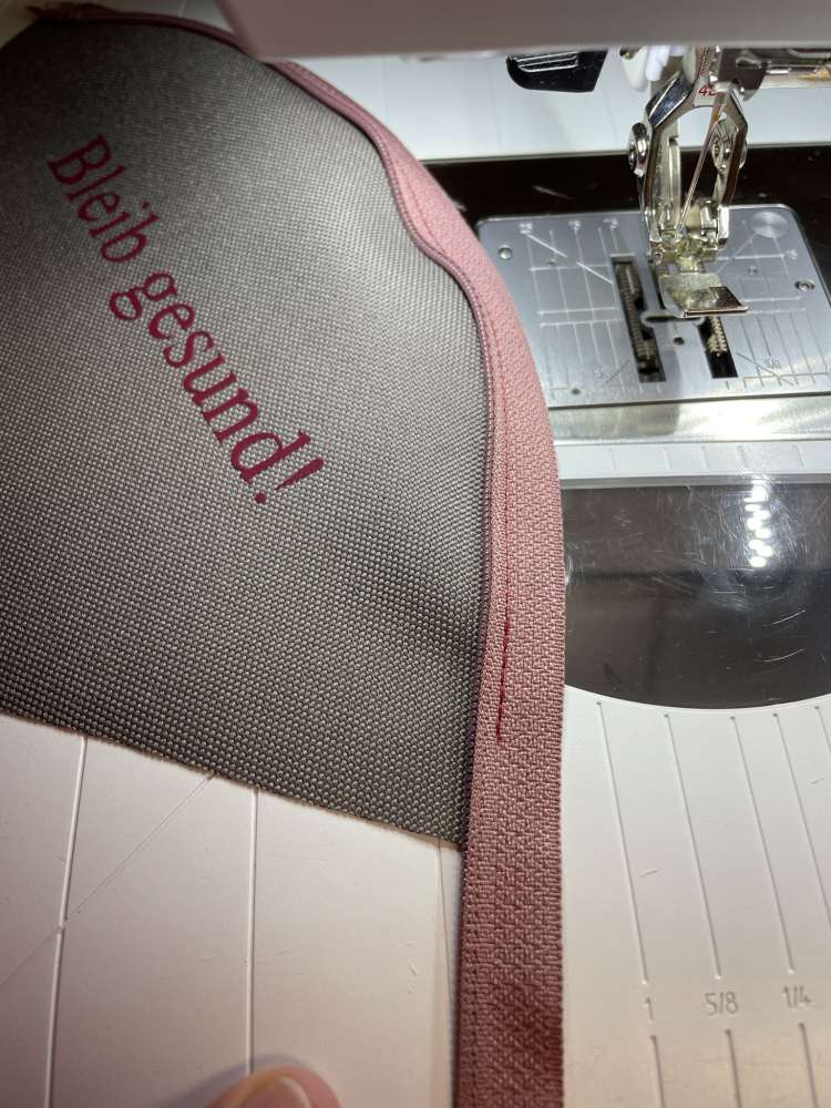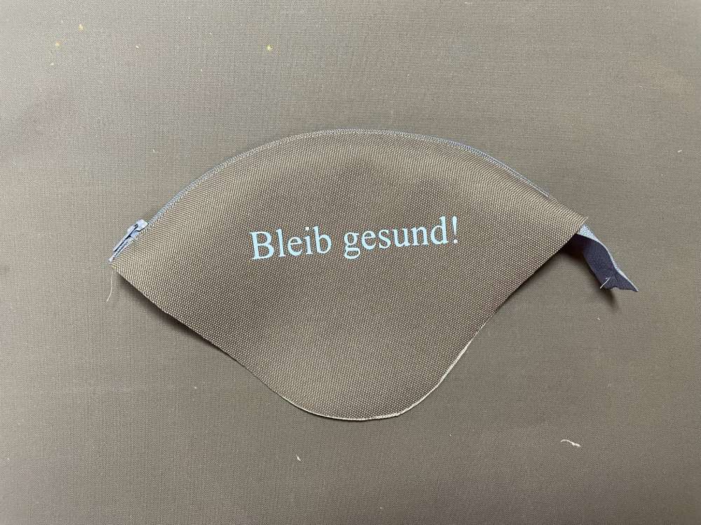 Bevor du beginnst zu nähen, solltest du, falls gewünscht, deinen Plott oder deine Verzierung auf dem Seitenteil anbringen. Ich habe einen einfachen Plott gemacht (geht übrigens prima auf dem Outdoor Waterproof Stoff!). «Bleib gesund!» auf der einen Seite und auf der andren die Formel für die Verbreitung eines Viruses – für meinen Vater, der Mathematiker ist, doch genau das Richtige!