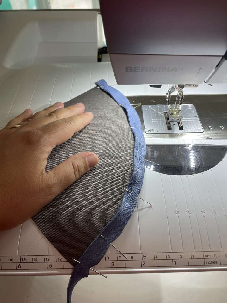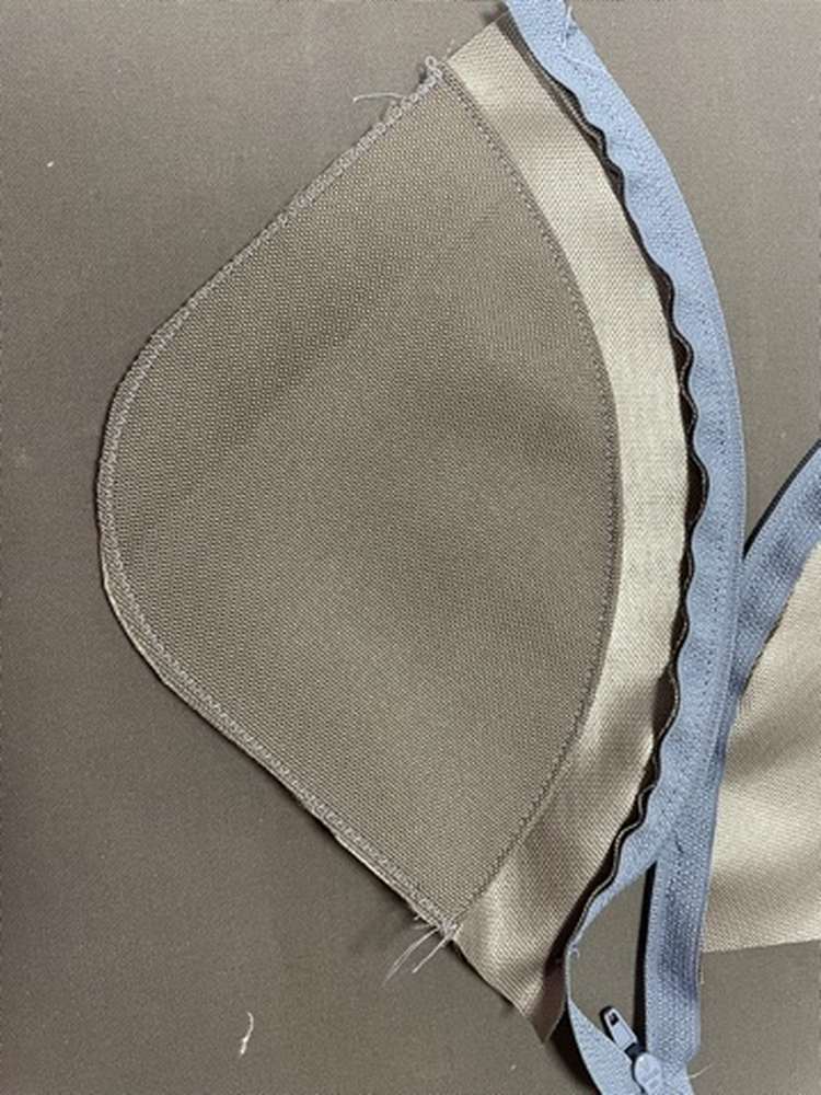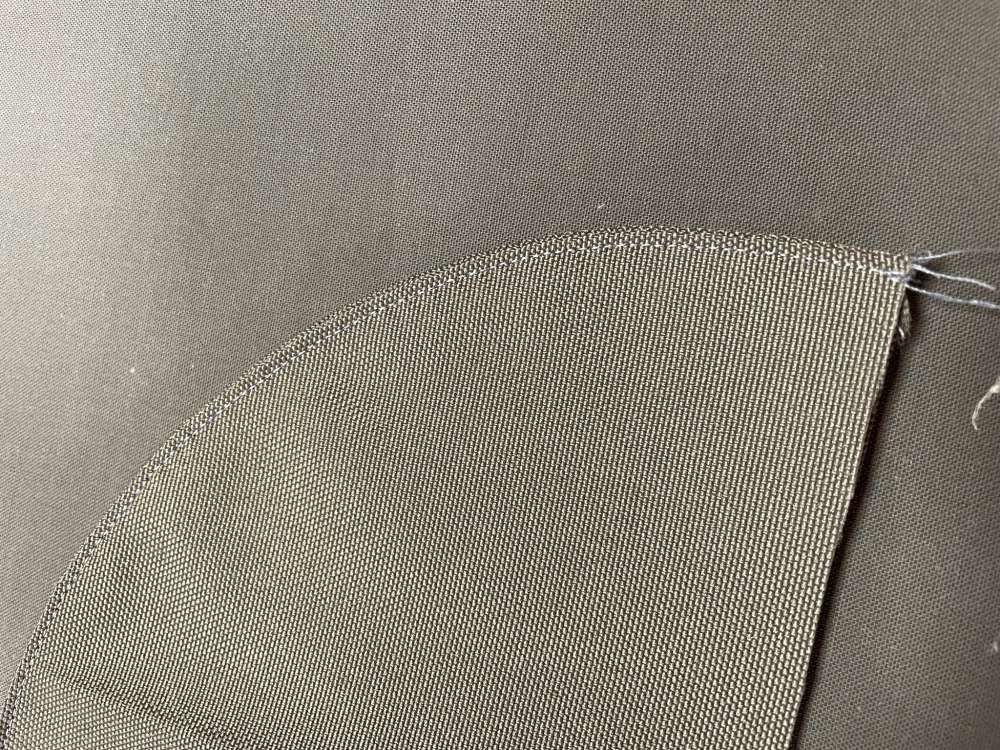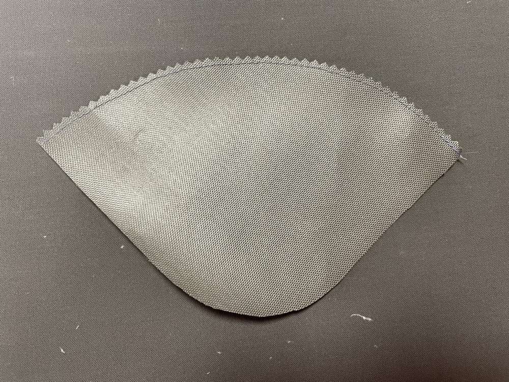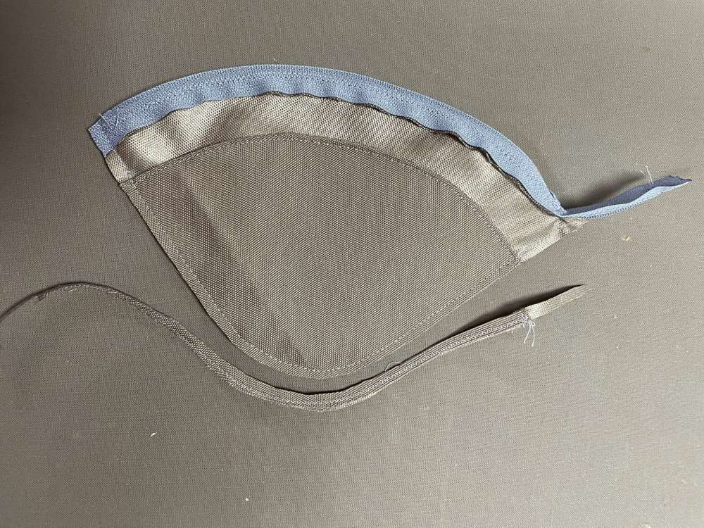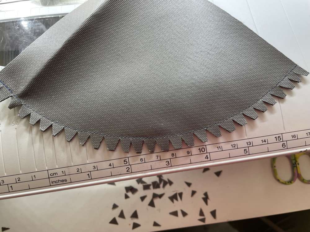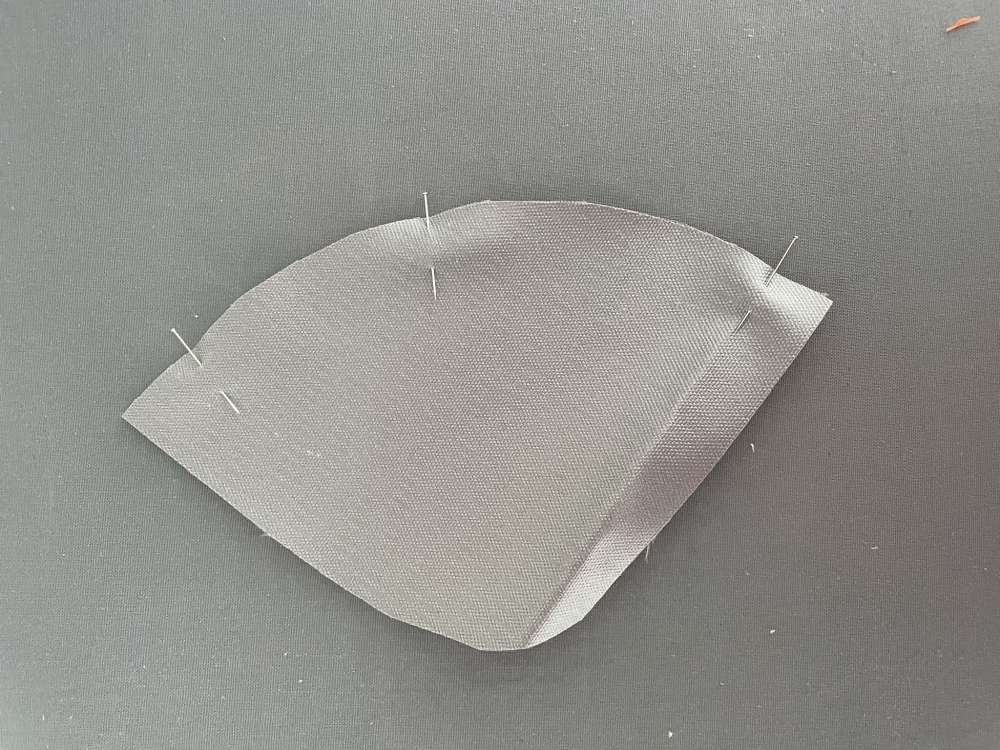 Das Schnittmuster für dieses Masken-Etui ist eigentlich einfach ein Viertelkreis mit 15.5cm Radius (Durchmesser von 31cm). Dabei wird einfach beim «Spitz» eine Rundung geschnitten, damit man besser rundum nähen kann.