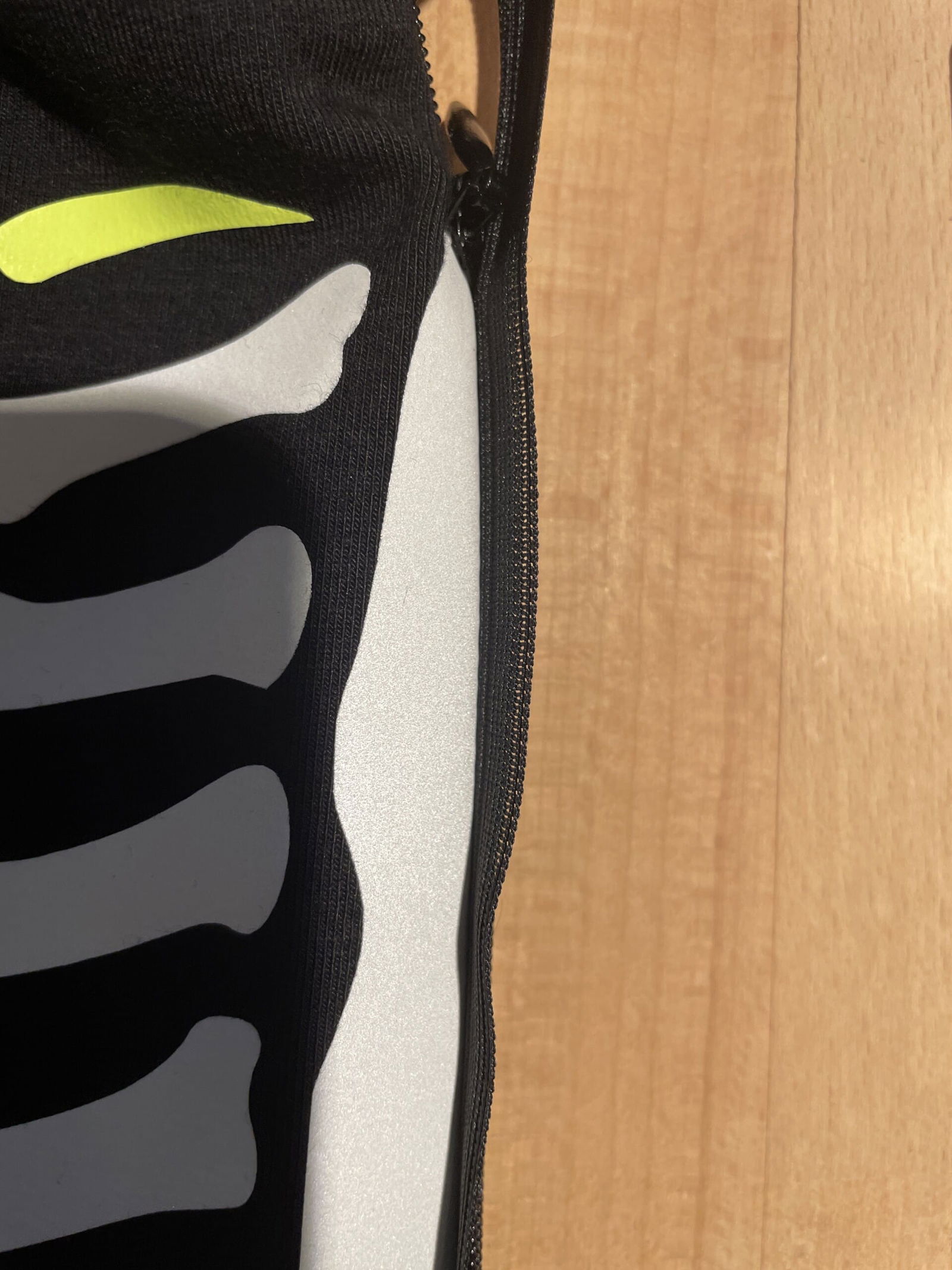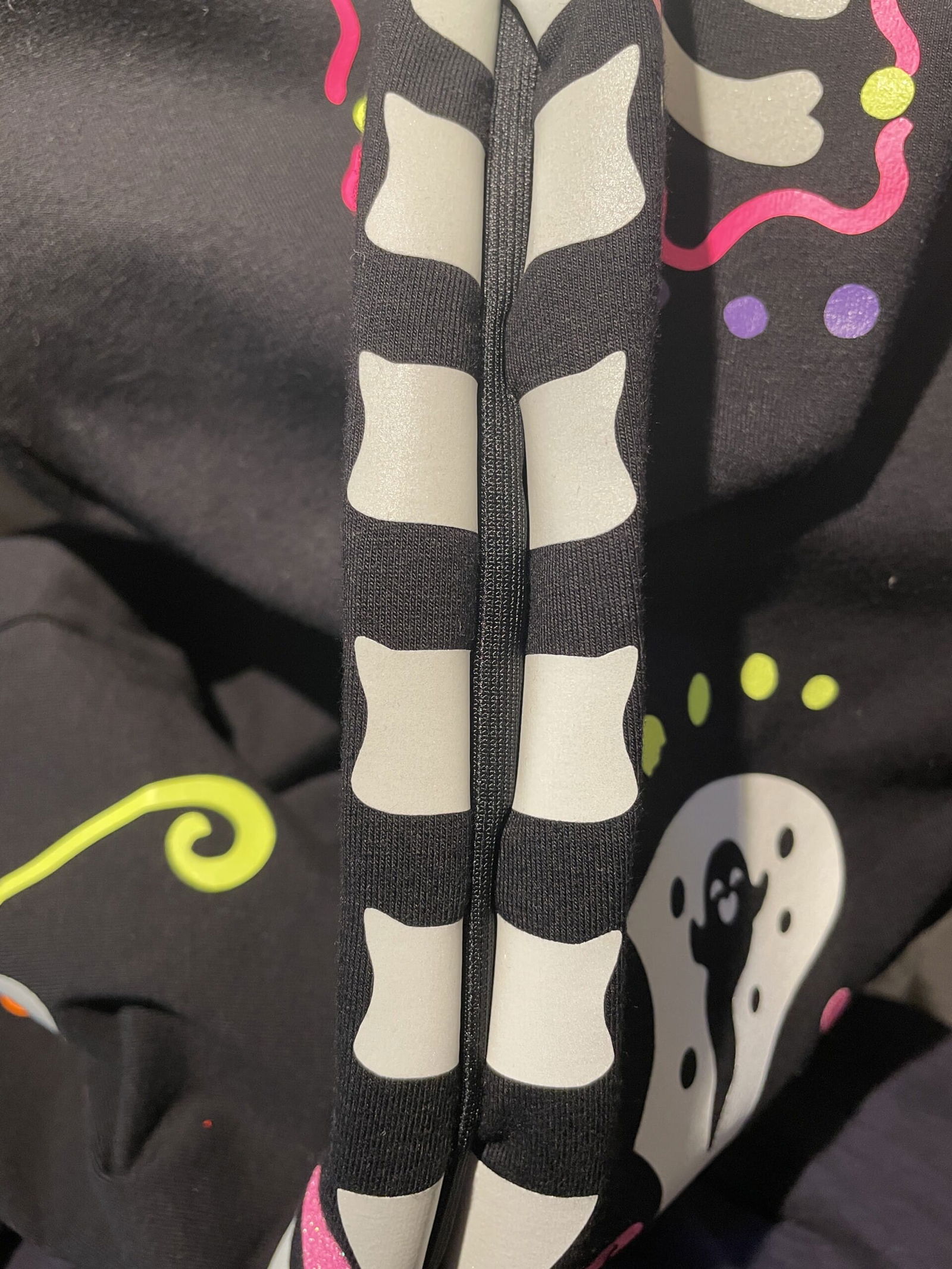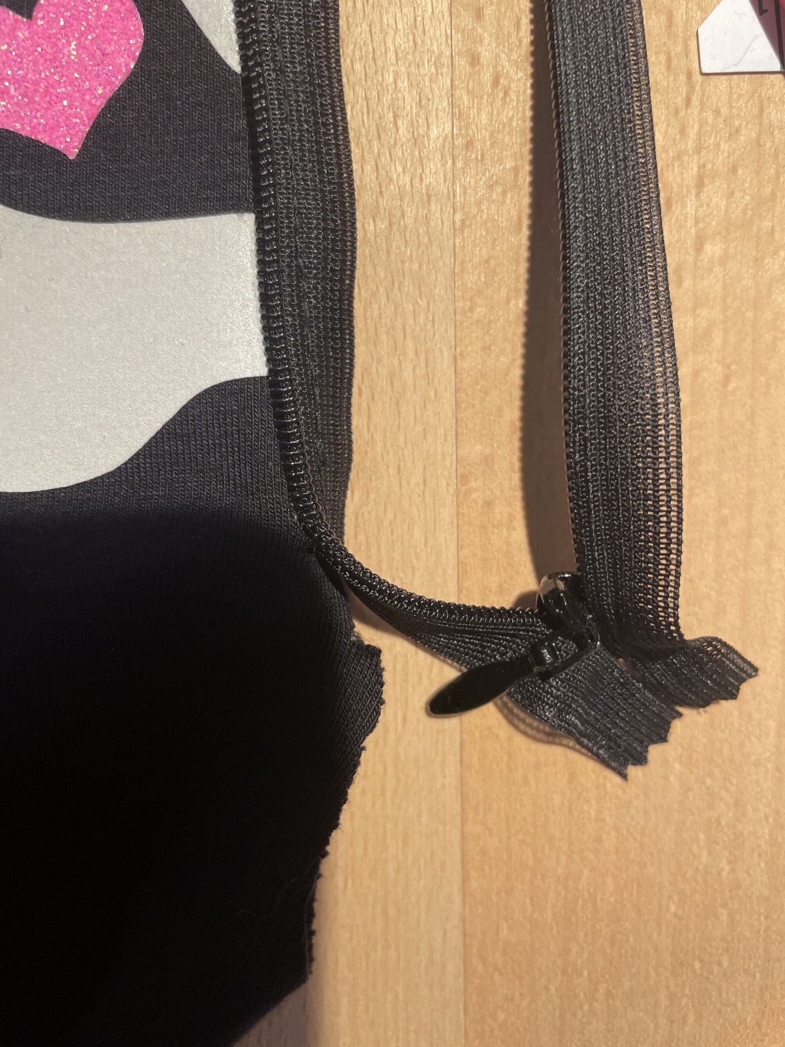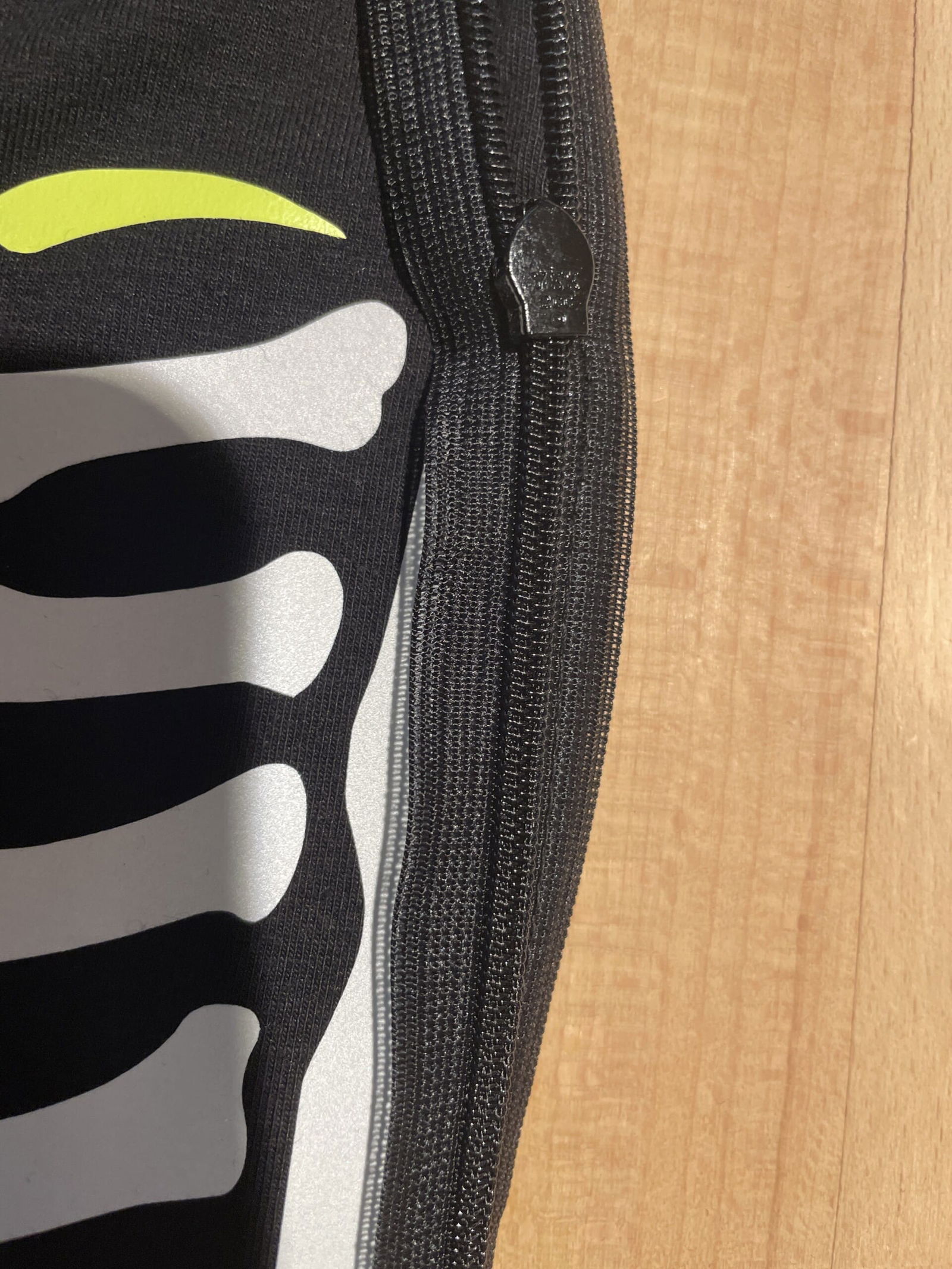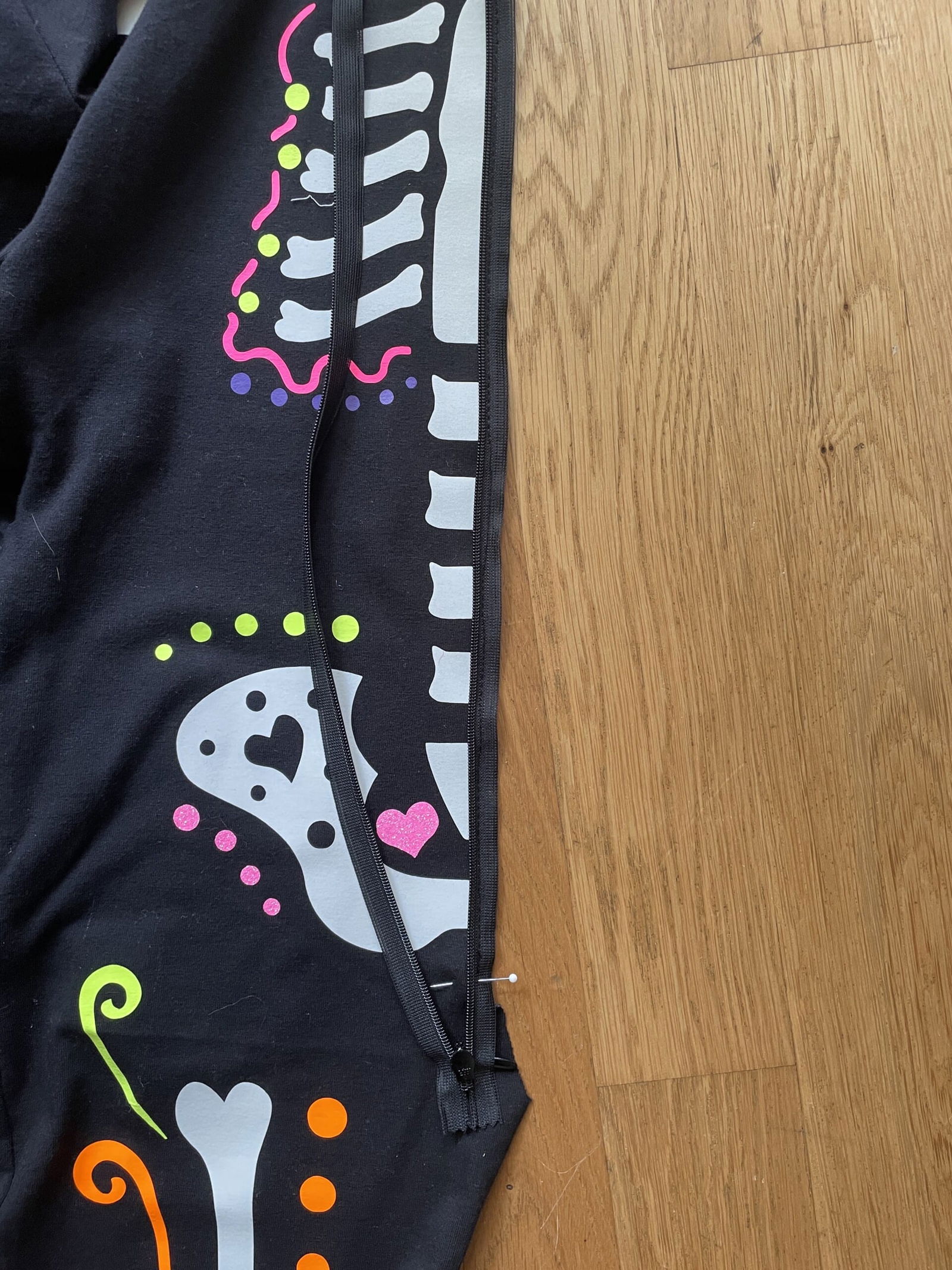 Für unseren tollen Halloween Overall haben wir vorne in der Mitte einen nahtverdeckten Reissverschluss eingenäht. Damit sah das Vorderteil trotz Reissverschluss praktisch durchgehend aus und der Skelett-Plott auf der Brust wurde optisch nicht durch einen Reissverschluss unterbrochen. Und trotzdem konnte man den Overall mit einem Reissverschluss vorne bequem öffnen zum an- und ausziehen.