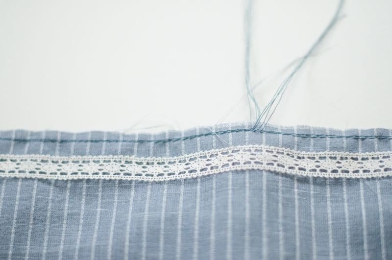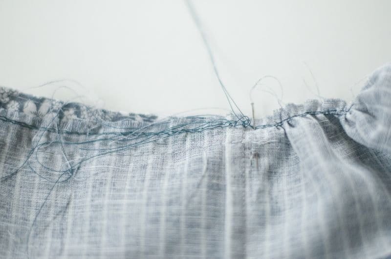 Je nachdem wieviel gekräuselt oder gerüscht wird, vierteile ich beide Teile, sodass die Weite schön verteilt ist. Bei kurzen Strecken lohnt sich das aber nicht und man muss einfach die Rüschen von Auge schön verteilen. Aber nun zum Rüschen. Ich ziehe nun am Unterfaden so fest bis du die gewünschte Rüschenlänge erreicht ist, also bis die Strecke der Rüschen gleich lang ist wie die des Halsausschnittes.