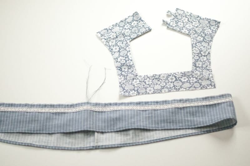So sehen nun meine Vorbereiteten Teile aus. Oben rechts das Halsausschnittstück an den ich das gerade Stück kräuseln/rüschen möchte.
