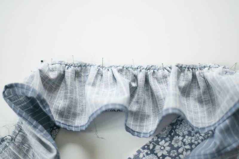 Stecke nun das gekräuselte rechts auf rechts auf das andere Schnitteil, hier meinen Halsausschnitt. Dabei achte ich darauf das das gekräuselte schön verteilt liegt und es nicht an einem Ort mehr gekräuselt ist als an einem anderen.