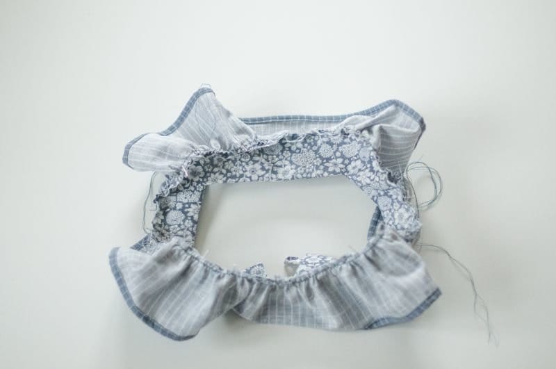 So sieht nun das vorbereitet Stück aus. Es ist wirklich wichtig beide Steppstiche zu nähen. Das Gekräuselte wird so viel regelmässiger und die Nahtzugabe rollt sich nicht ein. Das passiert vor allem bei Jersey gerne.