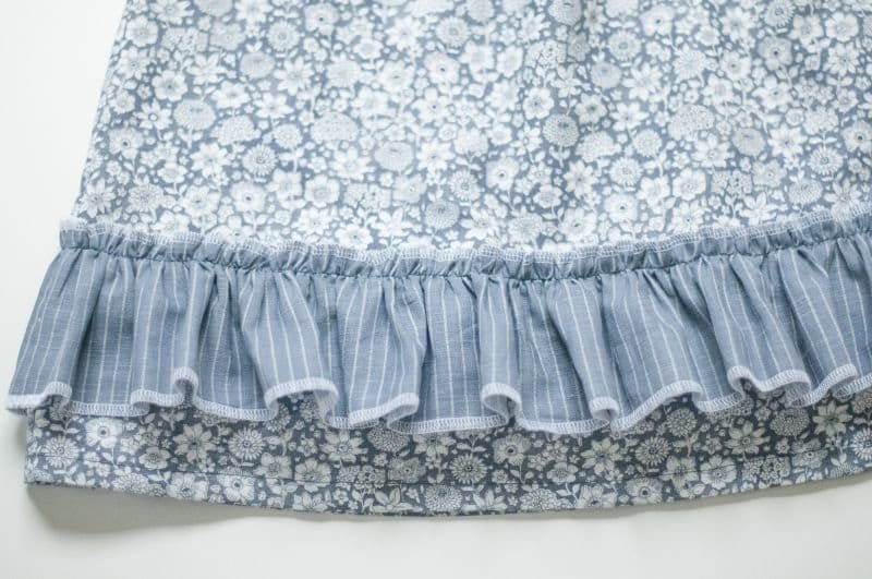 Als kleine Verzierung am unteren Teil des Kleides habe ich auch noch einen langen, gerüschten Streifen aufgenäht. Hier bin ich gleich vorgegangen wie eben beschrieben. Die Unterschiede hier sind, dass ich ausnahmsweise nur einen Kräuselstepp in Stichlänge 5 genäht habe. Begründen kann ich das, weil der Steppstich sichtbar ist und es nicht so schön aussieht wenn da am Ende drei Stepps nebeneinander zu sehen sind und weil ich den Steppstich 1,8cm von der Kante her genäht habe und somit kein Einrollen entstehen kann.Das zweite was ich etwas anders gemacht habe ist, dass ich das zu kräuselnde Stück nicht rechts auf rechts zusammen gesteckt und genäht habe, sondern links auf rechts und dann habe ich auf dem vorhanden Kräuselstepp mit normaler Stichlänge das Stoffstück aufgesteppt.