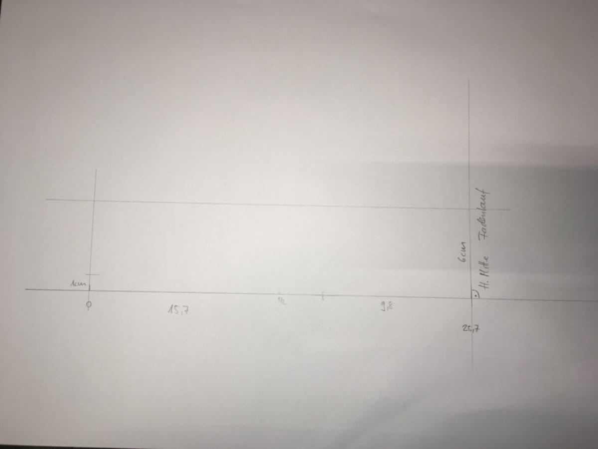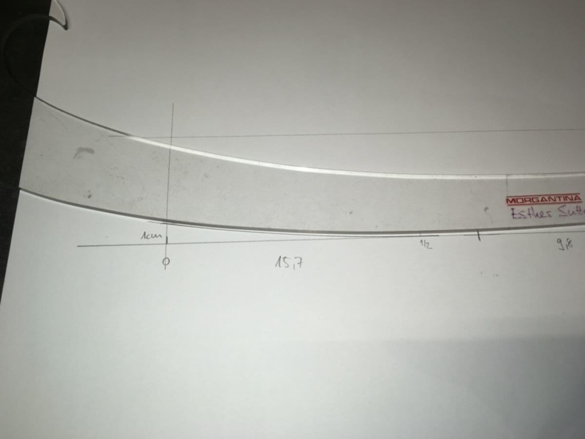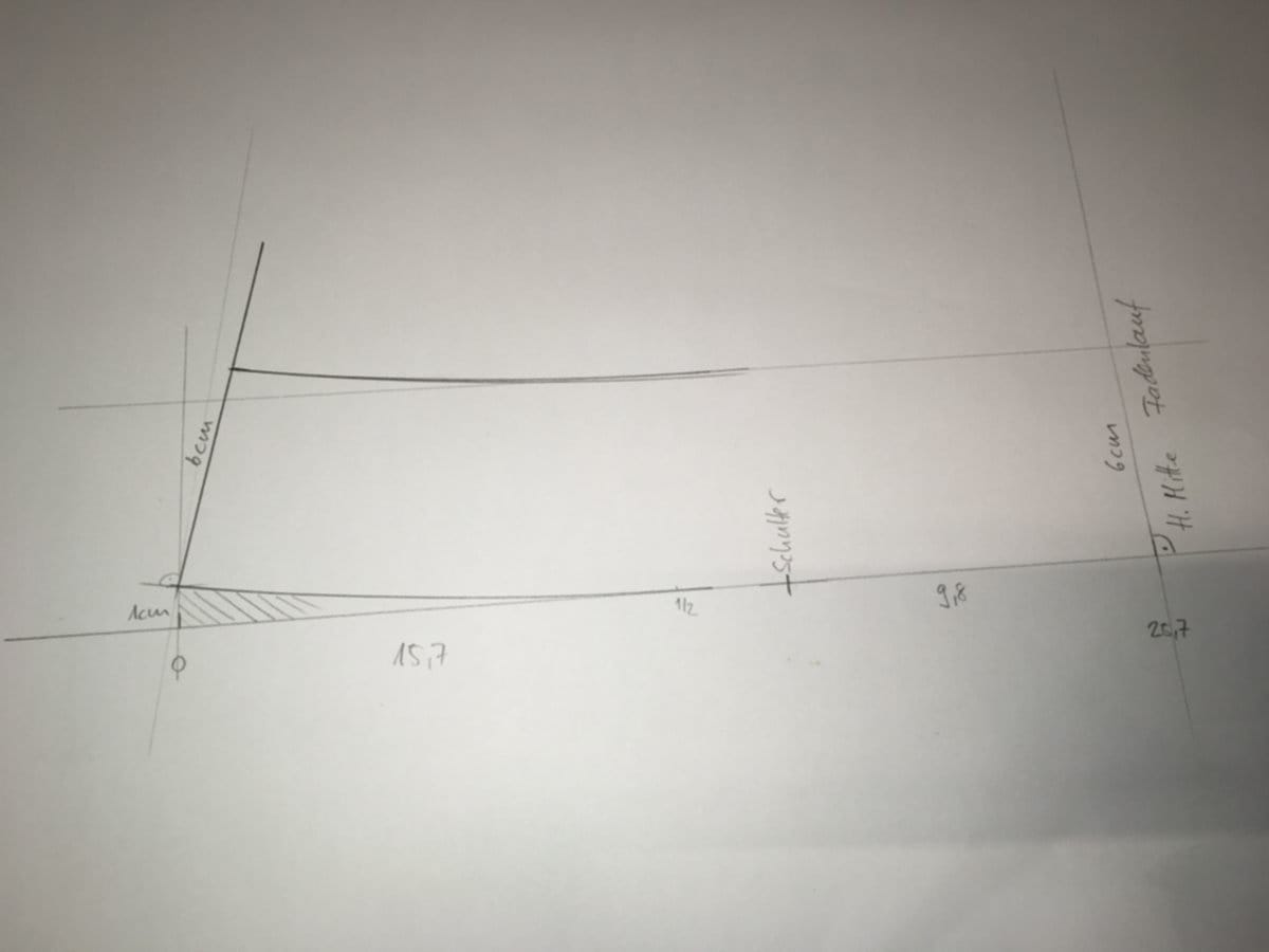 2. Nun zeichnen wir in der vorderen Mitte im rechten Winkel 1cm nach oben und verbinden diesen Punkt mit einem Kurvenlinieal mit der Grundlinie.