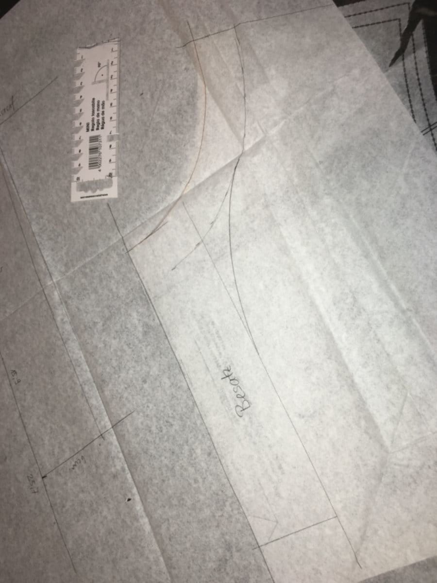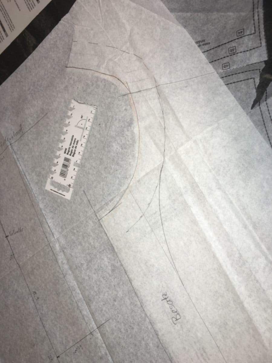 Der Besatz ist im Prinzip einfach ein Stück stoff, ca. 5cm breit vom Halsausschnitt weg. Für die Konstruktion legst du am besten das Vorder- und Rückenteil wieder an der Schulternaht zusammen und kopierst den Halsausschnitt. Von dort zeichnest du nun eine parallele Linie in 5cm Abstand.