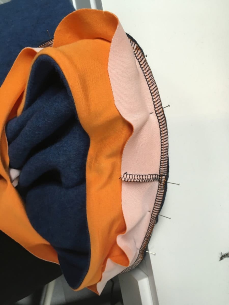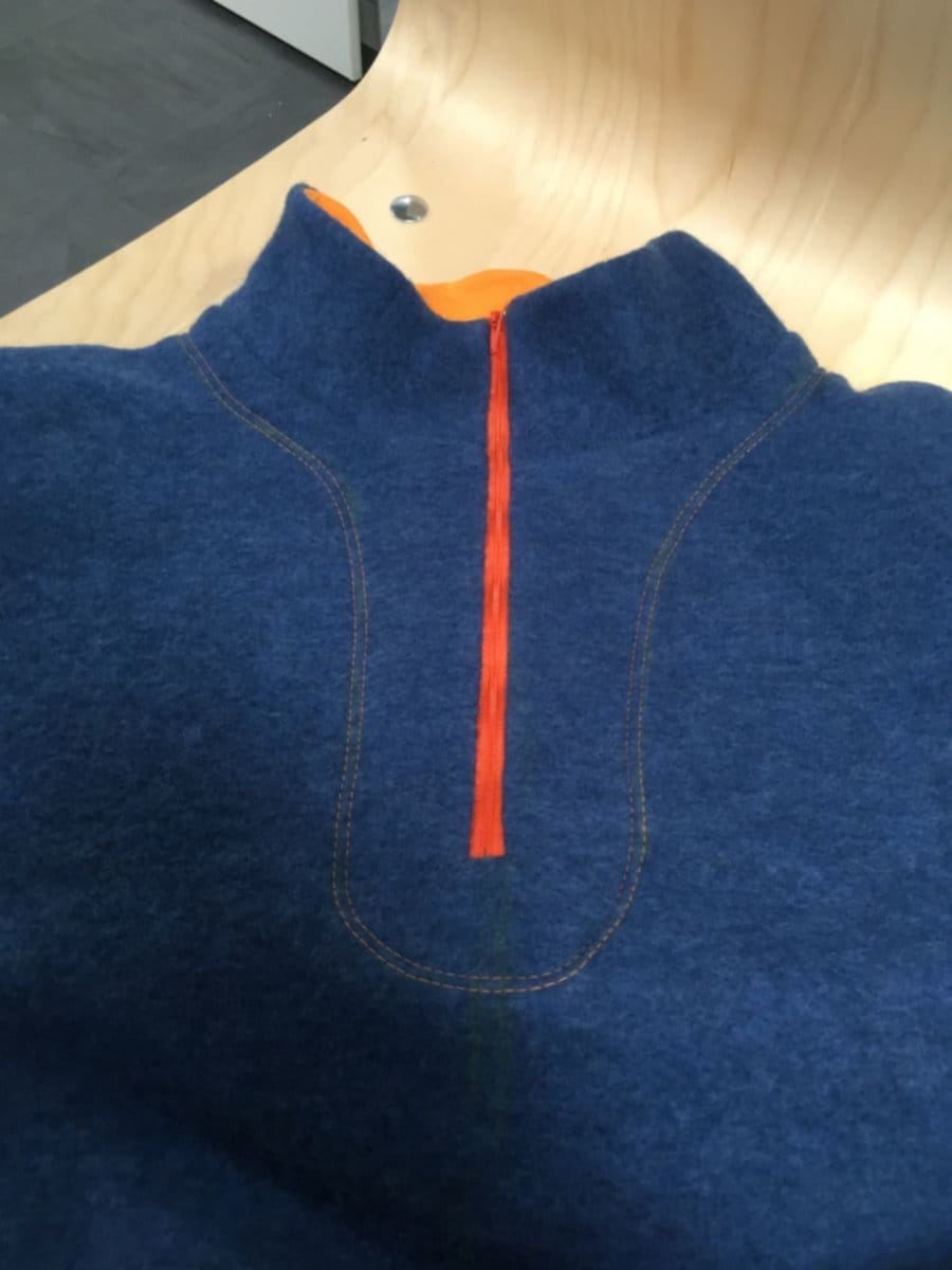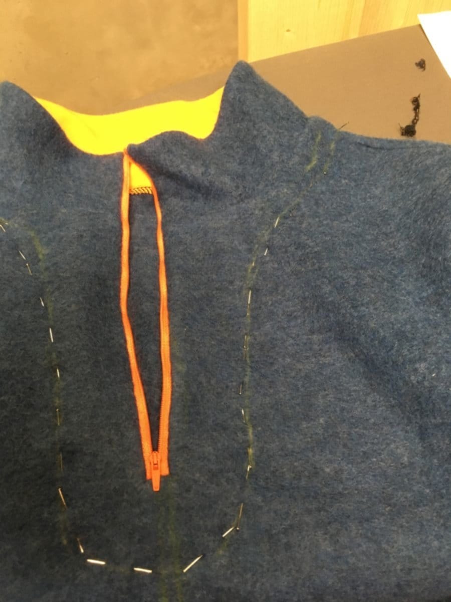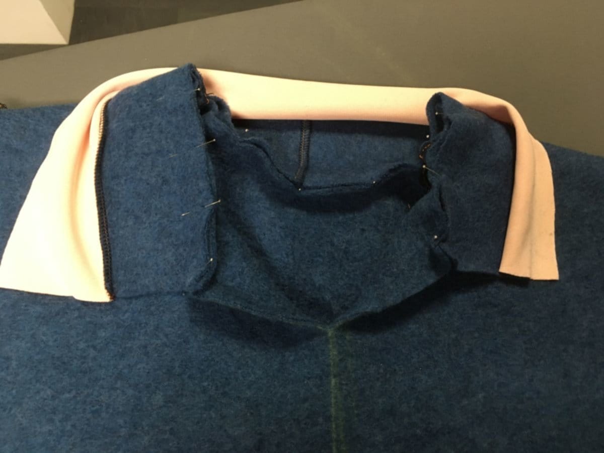 Ich wollte den Halsausschnitt nicht extrem eng am Hals haben – weils sonst zu warm gewesen wäre und ich noch nicht 100% sicher war, ob der Wollfleece auch wirklich nicht beisst… Also habe ich den Halsausschnitt etwas vom Hals entfernt.