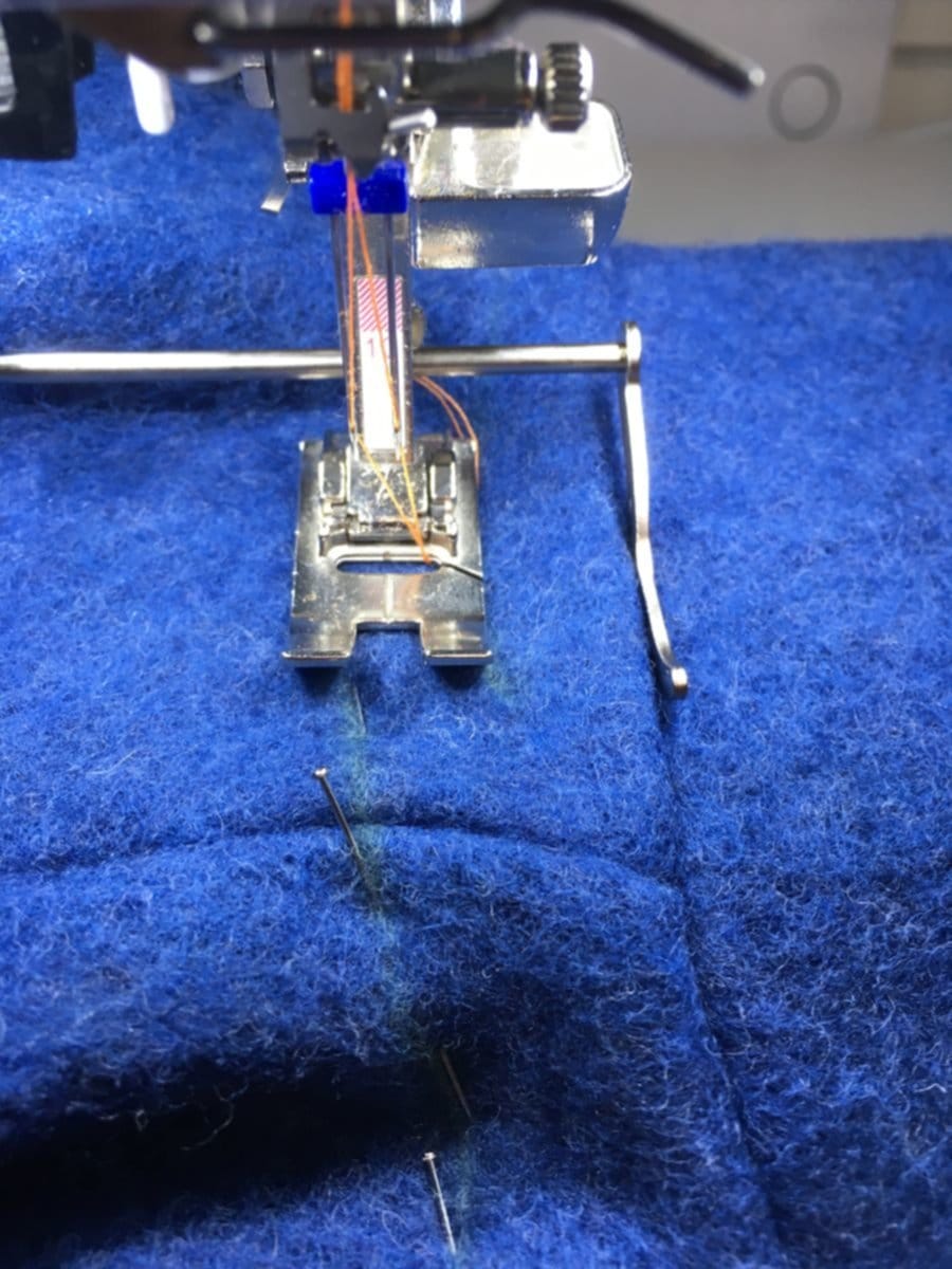 - Das Absteppen geht am einfachsten, wenn du den Abstandsmesser bei deinem Füsschen montierst und so immer schön parallel zur Halsausschnittnaht nähst
