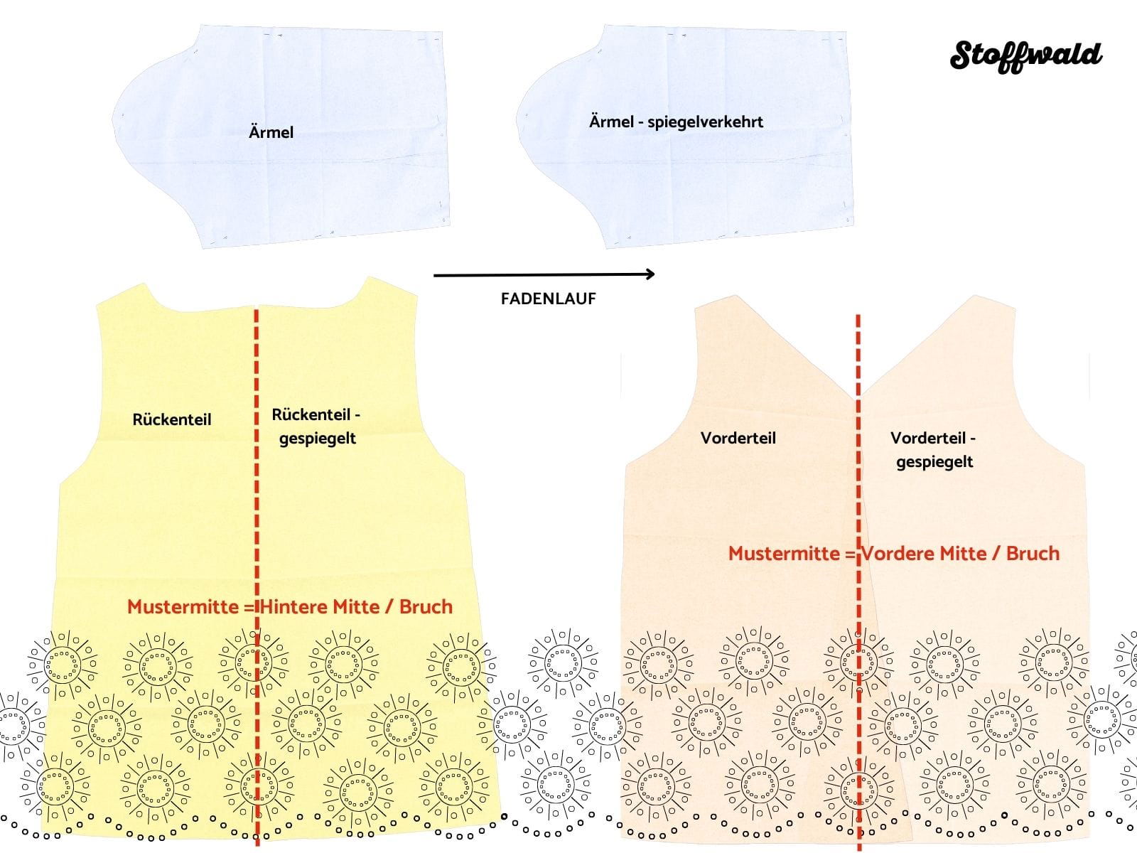 Wichtig ist nun auf das Muster der Borde zu achten und dein Schnittmuster mittig, resp. symmetrisch aufzulegen. Hier kommen wir zum zweiten Faktor, welcher die benötigte Stoffmenge beeinflusst. Du brauchst etwas Spielraum für diese mittige Platzierung. Um sicher zu gehen, dass du das hast, empfehlen wir 0.5m mehr Stoff zu bestellen.