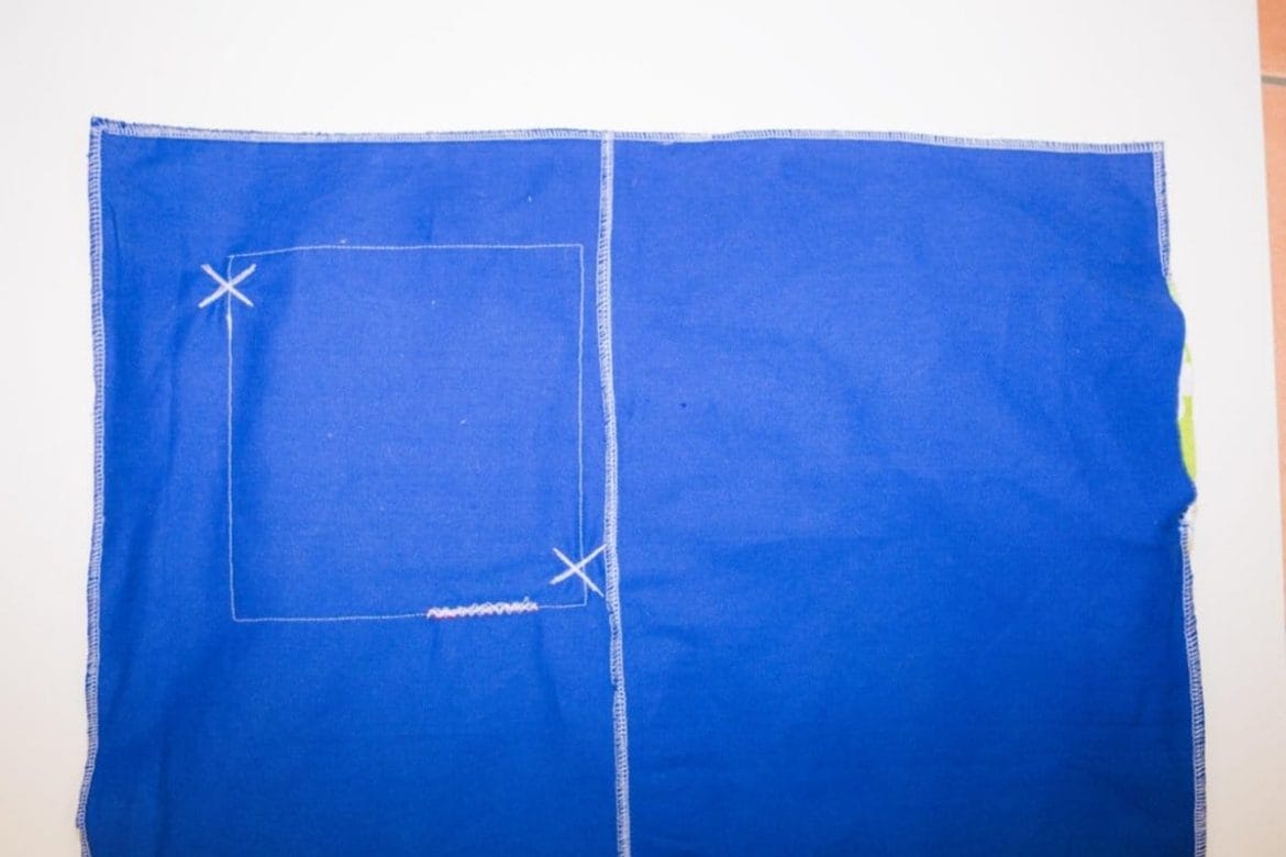 jeweils in derselben gewünschten Grösse. In meinem Beispiel sind die Rechtecke 60 x 70 cm gross. Es empfiehlt sich aufgrund der Stabilität nicht allzu dünne Stoffe zu verwenden.