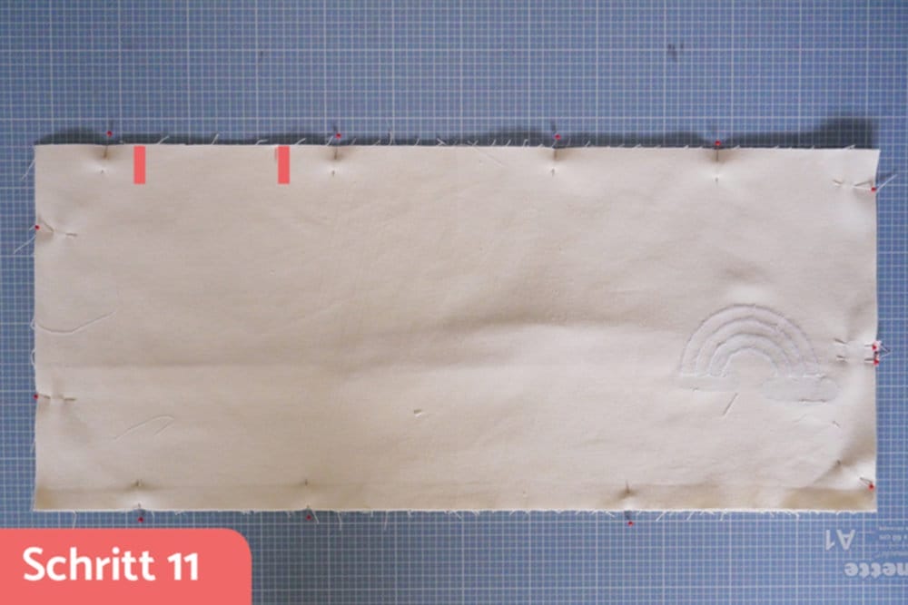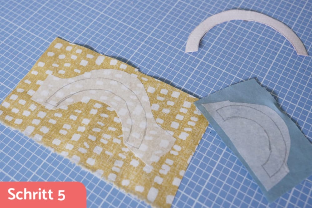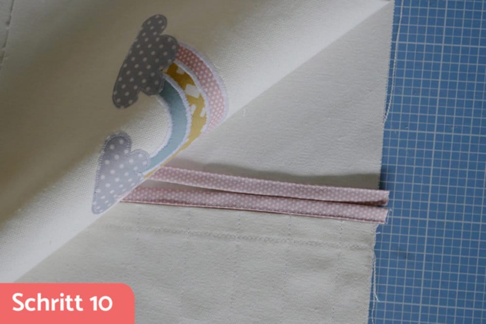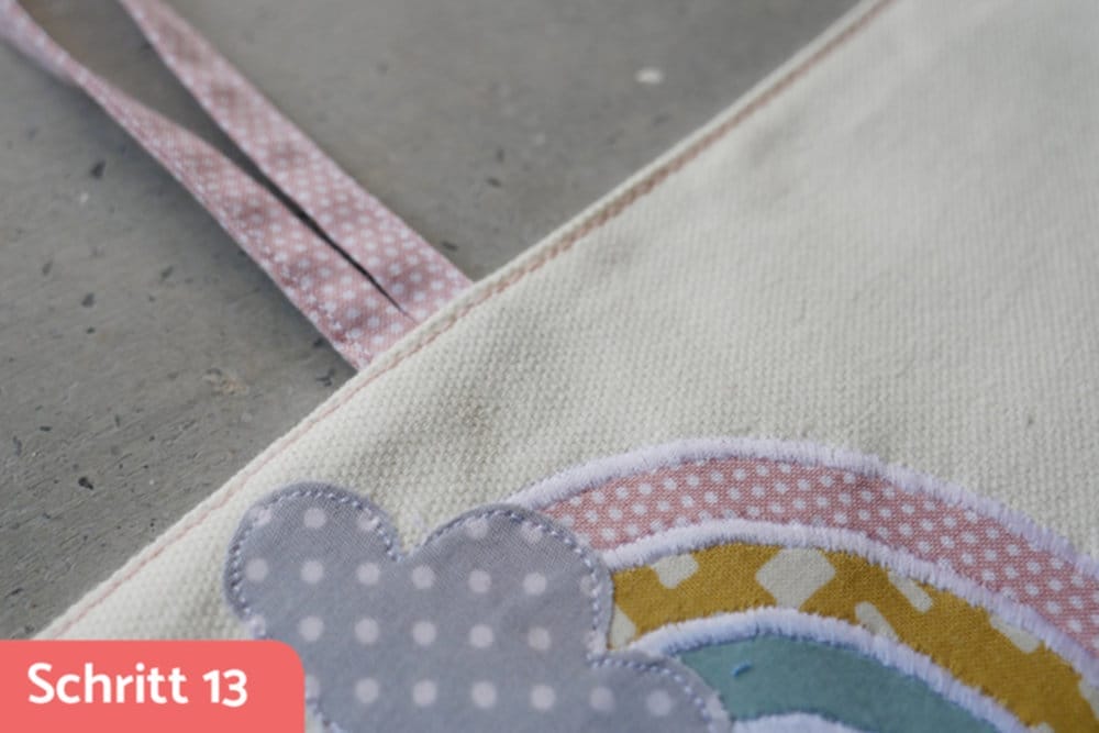 Das Lieblingsmotiv meiner Tochter ist momentan der Regenbogen, deshalb machte ich ihr eine Freude und applizierte aus Restenstoffen einen auf die Aussenseite. Man kann diesen Schritt natürlich einfach auslassen, aber wer baut nicht auch gerne mal seine Restenstoff-Kiste ab?