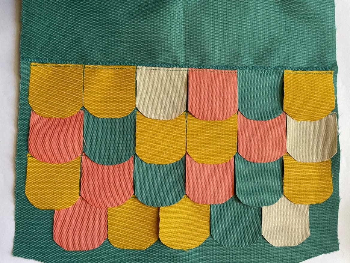 Für den Fischkörper Light Petrol, den Fischschwanz Ocker und die Lippen Lachsfarbe ausgesucht. Aus den gleichen Farben plus Ecru habe ich die 23 Schupppen zugeschnitten.