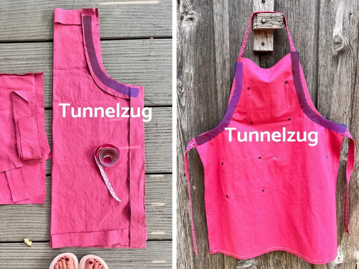 Dazu machst du mit Belegen entlang den Rändern ein Tunnel, durch welche du die Schleife ziehst. Bindest du diese hinten zu, passt sich die Grösse am Hals automatisch an.