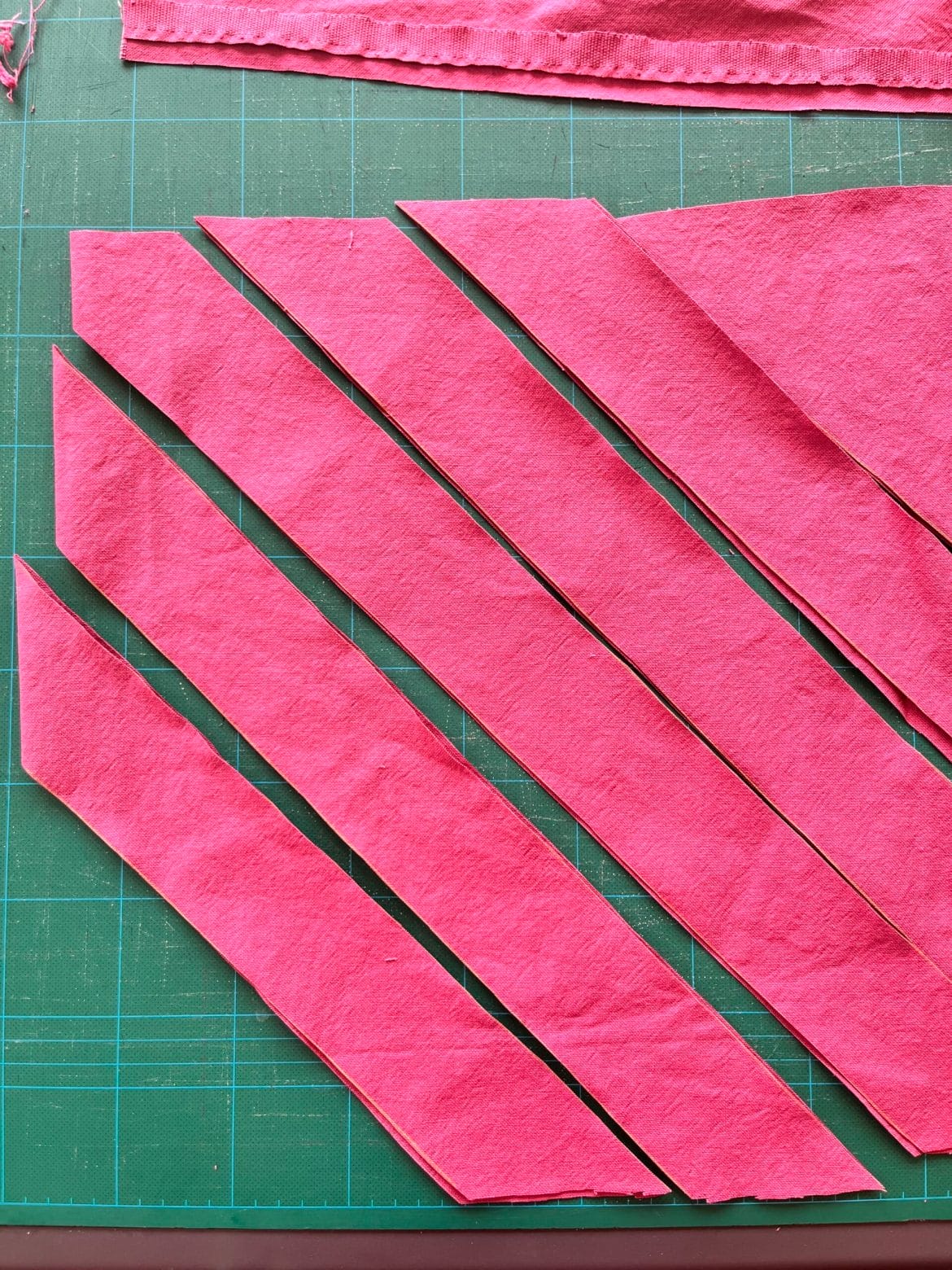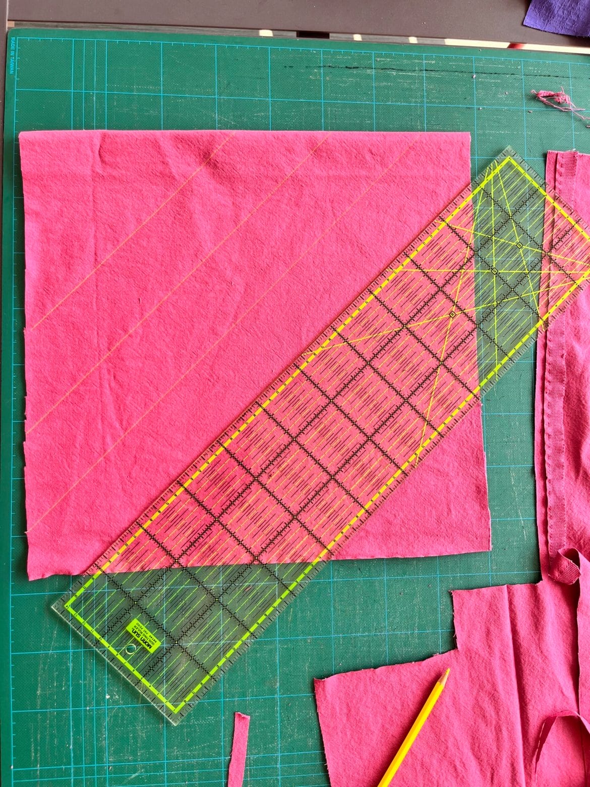 Mach Schrägbander die du als Belege benutzt. Dazu nimmst du ein Stück deines Stoffes, faltest es zu einem Quadrat. Darauf markierst du dir diagonal Streifen in gleicher Grösse.
