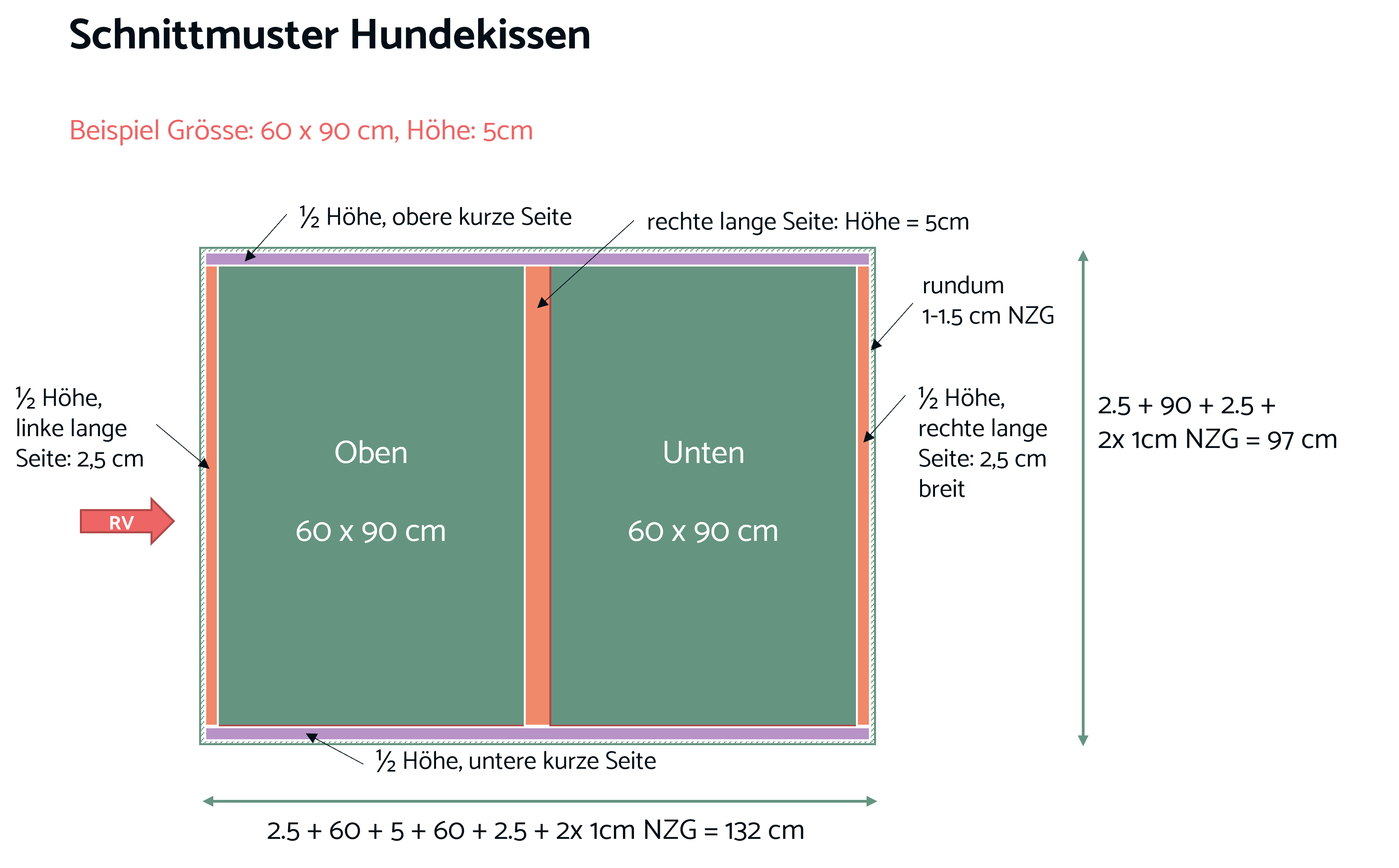 Als erstes musst du die Grösse deines Hundekissens bestimmen. Für meinen Labrador, der ausgewachsen über einen Meter lang ist, habe ich eine fertige Grösse des Kissens von 90x60cm gewählt.