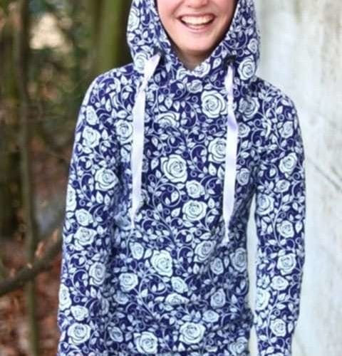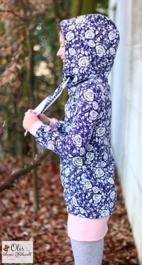 Damit die Kapuze des Hoodiekleides einen so schönen Stand hat, wie das von der Tochter gewünscht wurde, hat Olivia diese beispielsweise mit Vlies H250 verstärkt. Zudem wurde der Hoodieschnitt zu einem Kleid verlängert.