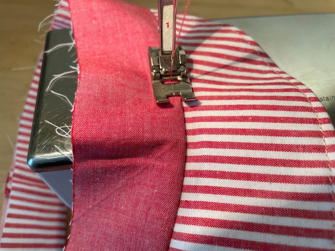 Materialbedarf: Besonders gut eigenet sich Baumwolle, ab 130g/m2, Jeans oder Crepe-Stoff. Es darf Uni oder gemustert sein, wie es dir gefällt. Ich habe mich für einen Streifen Baumwolle in Rot mit dem Uni Baumwolle im gleichen Rot entschieden. So konnte ich eine tolle Farbkombination für die Wendemöglichkeit erzeugen.