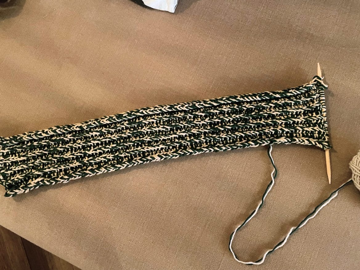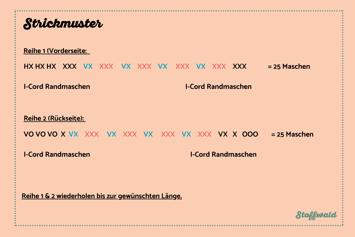 Gestrickt wird im Halbpatent mit I Cord Randmaschen.