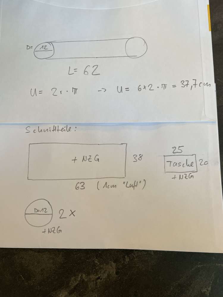 Nun musst du dir kurz das Schnittmuster für deinen “Zylinder” (eben die Tasche) zeichnen. Dafür brauchst du eine Mathe-Formel aus der Schule, nämlich die, dass der Umfang eines Kreises gleich dem Durchmesser mal “Pi” ist. “Pi” ist die Zahl, die mit 3.14 anfängt.