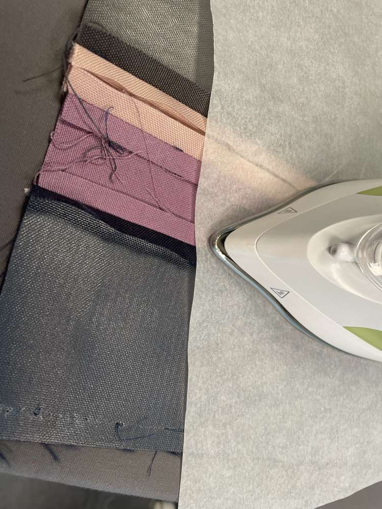 Wenn du einen Nylon-Stoff verwendest wie z.B. den Outdoor Waterproof, musst du zum Bügeln ein Backpapier drunterlegen, wenn du nicht willst, dass nachher alles am Bügeleisen klebt.