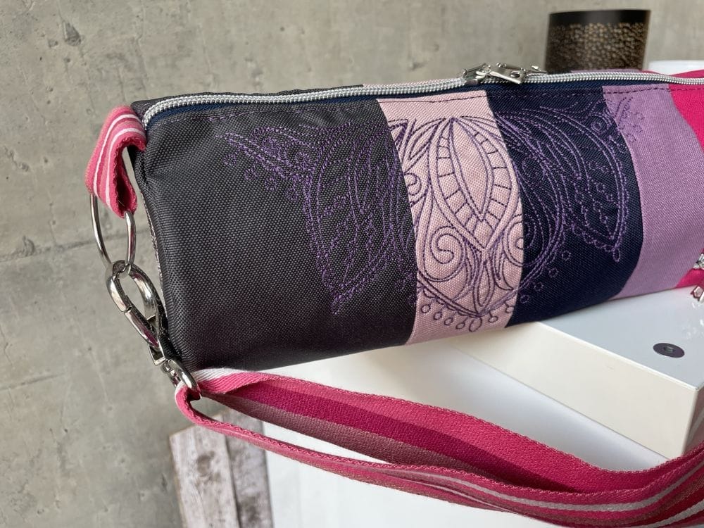 Deshalb hab ich das Seitenteil mit indischen Mustern bestickt. Die schönen Stick-Motive fand ich wie immer bei Embroidery Library. Ich habe ein Mandala für Boden und Deckel benutzt und eine Bordüre habe ich 4 x auf die Seiten neben den Reissverschluss gestickt.