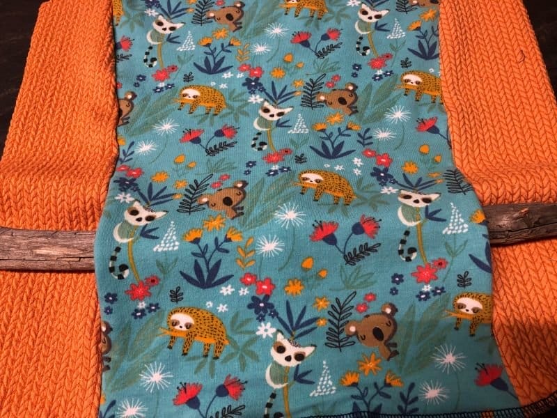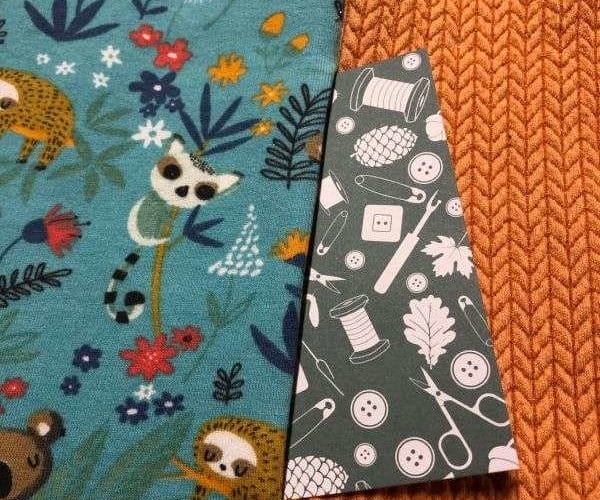 - Hinteres Futter der Tasche (Muster): In der gleichen Grösse wie das vordere Futter der Tasche – auf den Fotos hier hat es ebenfalls das Faultier-Design wie das mittlere Vorderteil. Dieses Teil sieht man, wenn sich die Tasche öffnet.