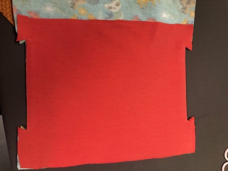 - Vorderes Futter der Tasche (rot): Einmal so breit wie das mittlere Vorderteil und so hoch wie die Höhe der Tasche plus Nahtzugabe – auf den Fotos hier ist es das rote Teil